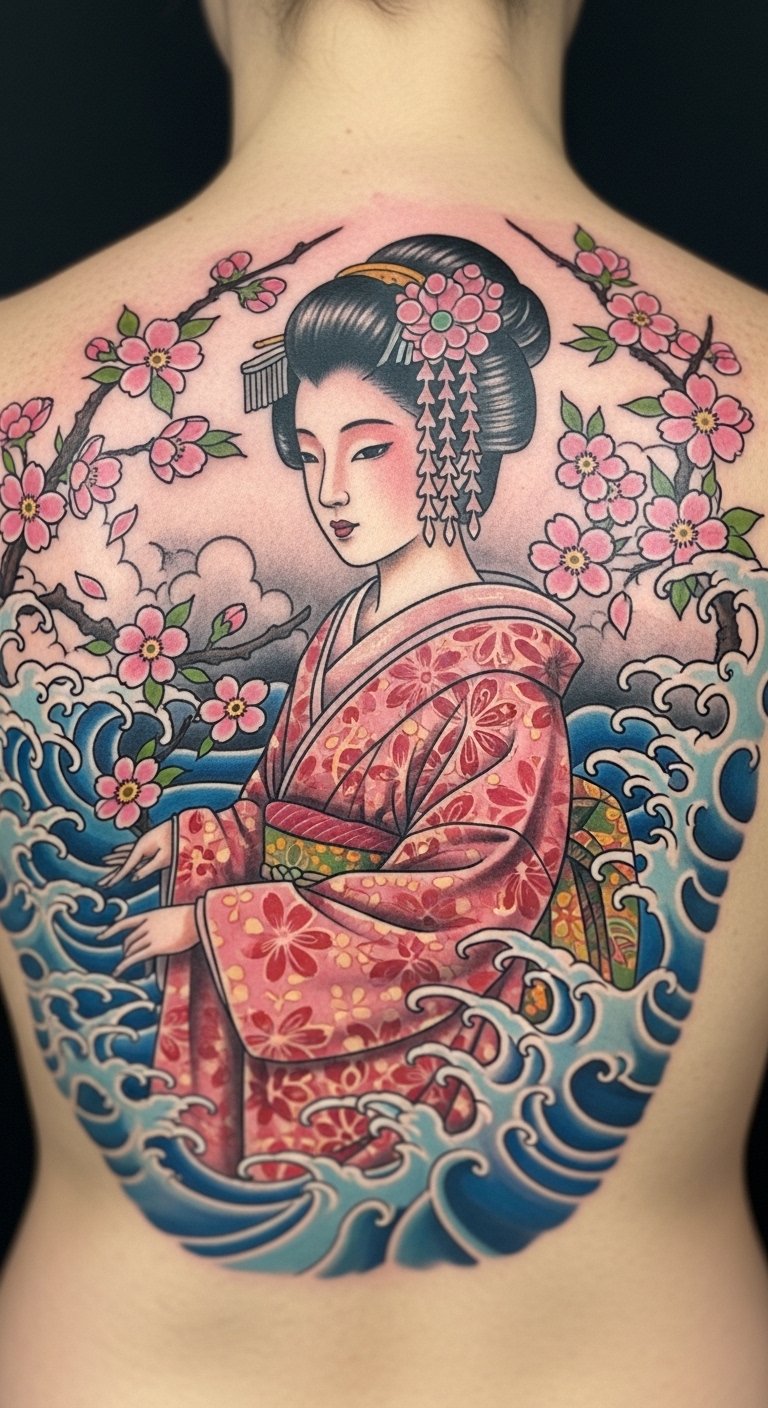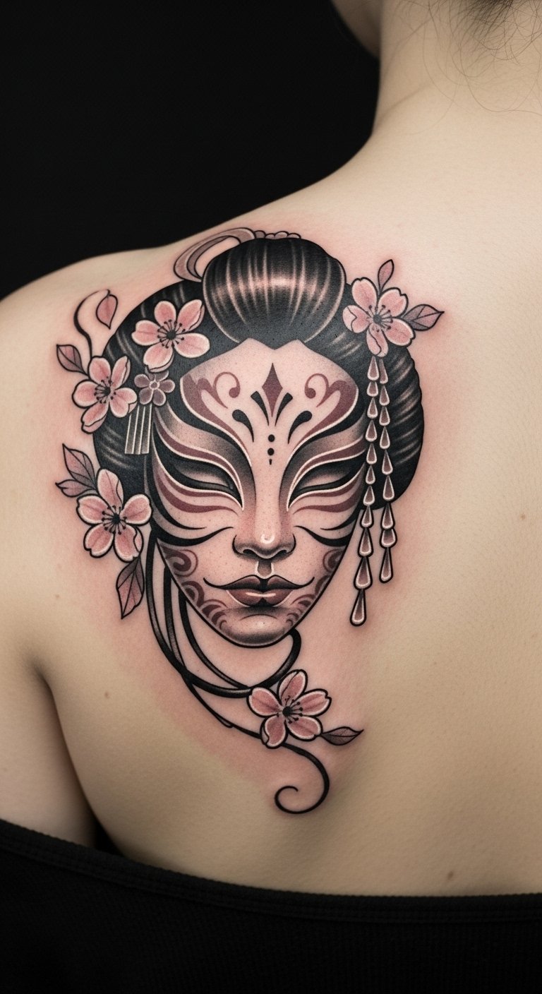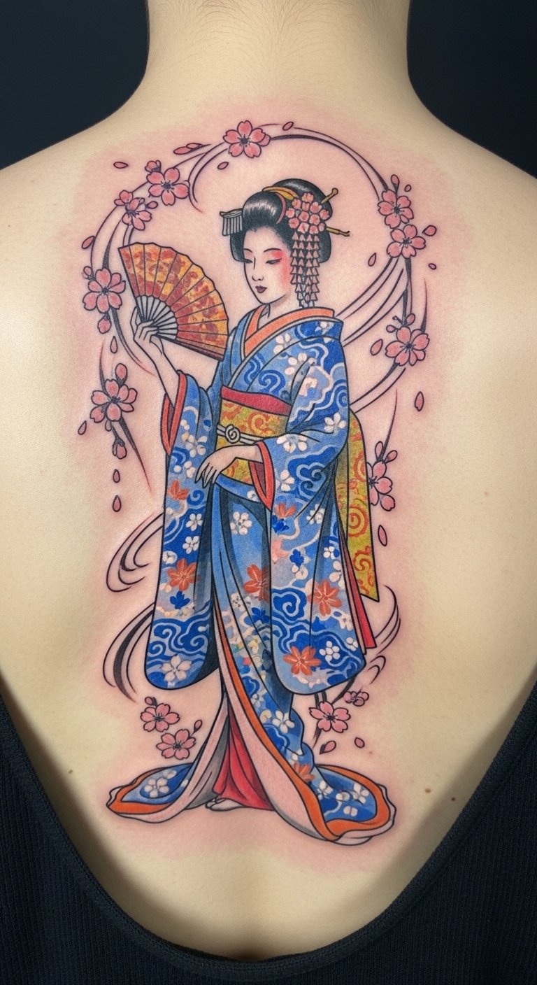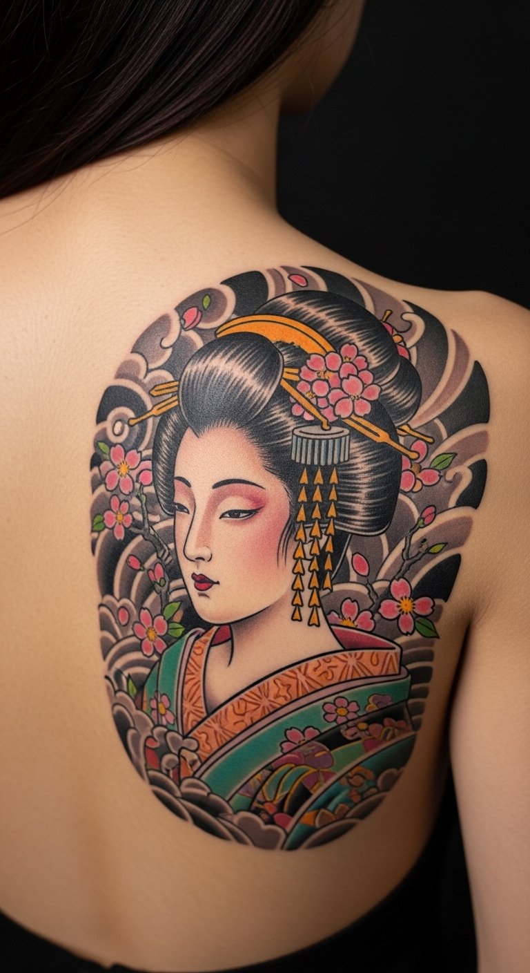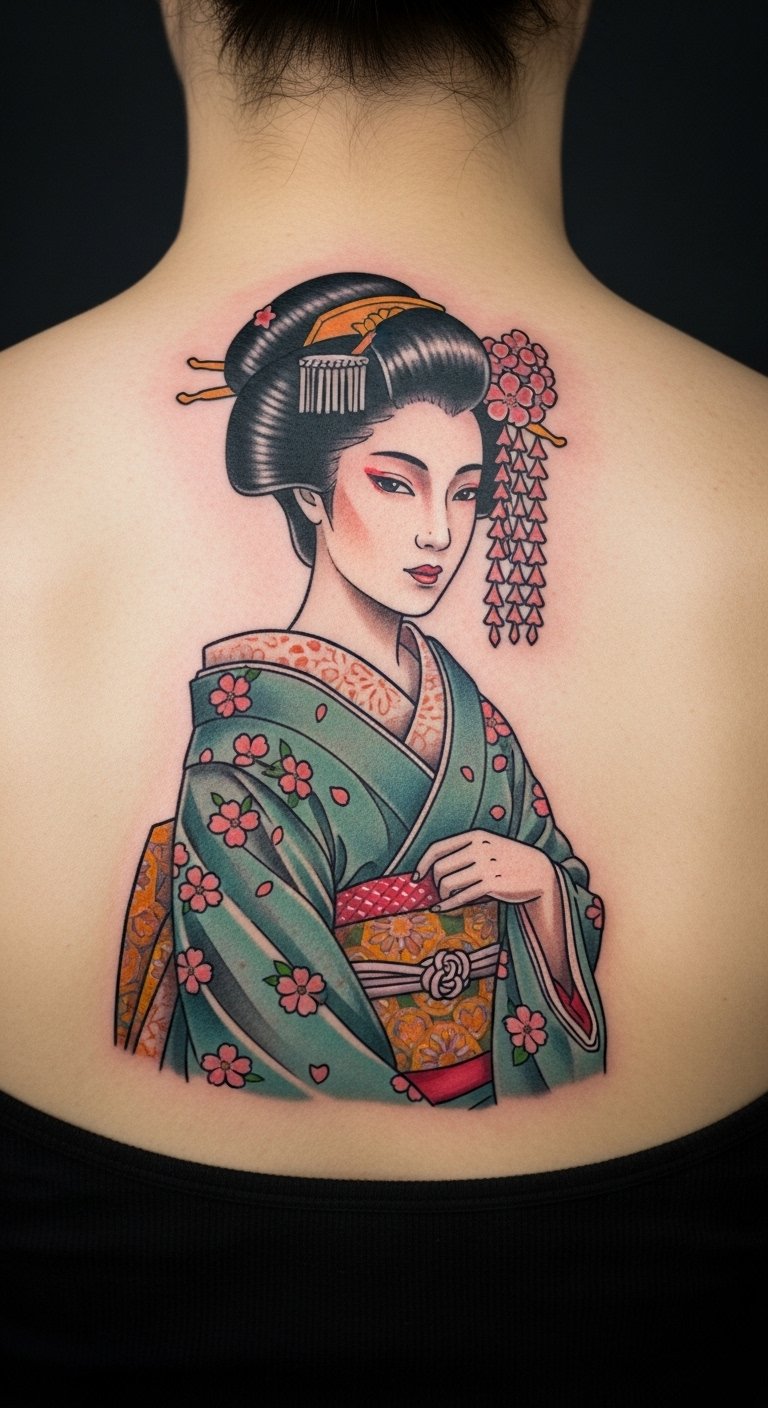 The placement on the upper back offers a canvas that allows for a larger, more intricate design, emphasizing the beauty and grace associated with geishas.