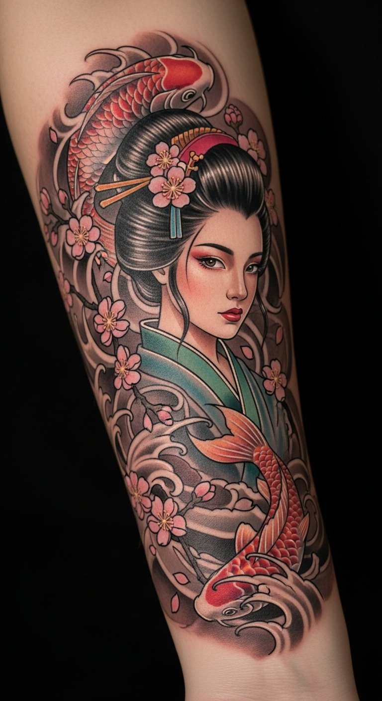 The geisha represents grace and resilience, while the cherry blossoms signify the fleeting beauty of life, and the koi fish embodies strength and perseverance.