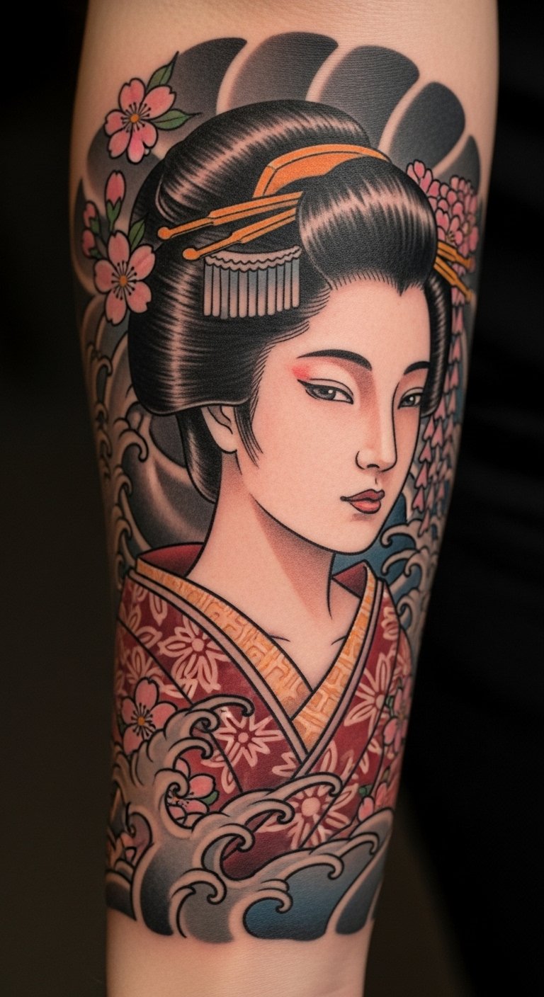 This tattoo symbolizes the beauty of cultural artistry and the rich heritage of Japan, embodying the elegance and grace of a geisha.