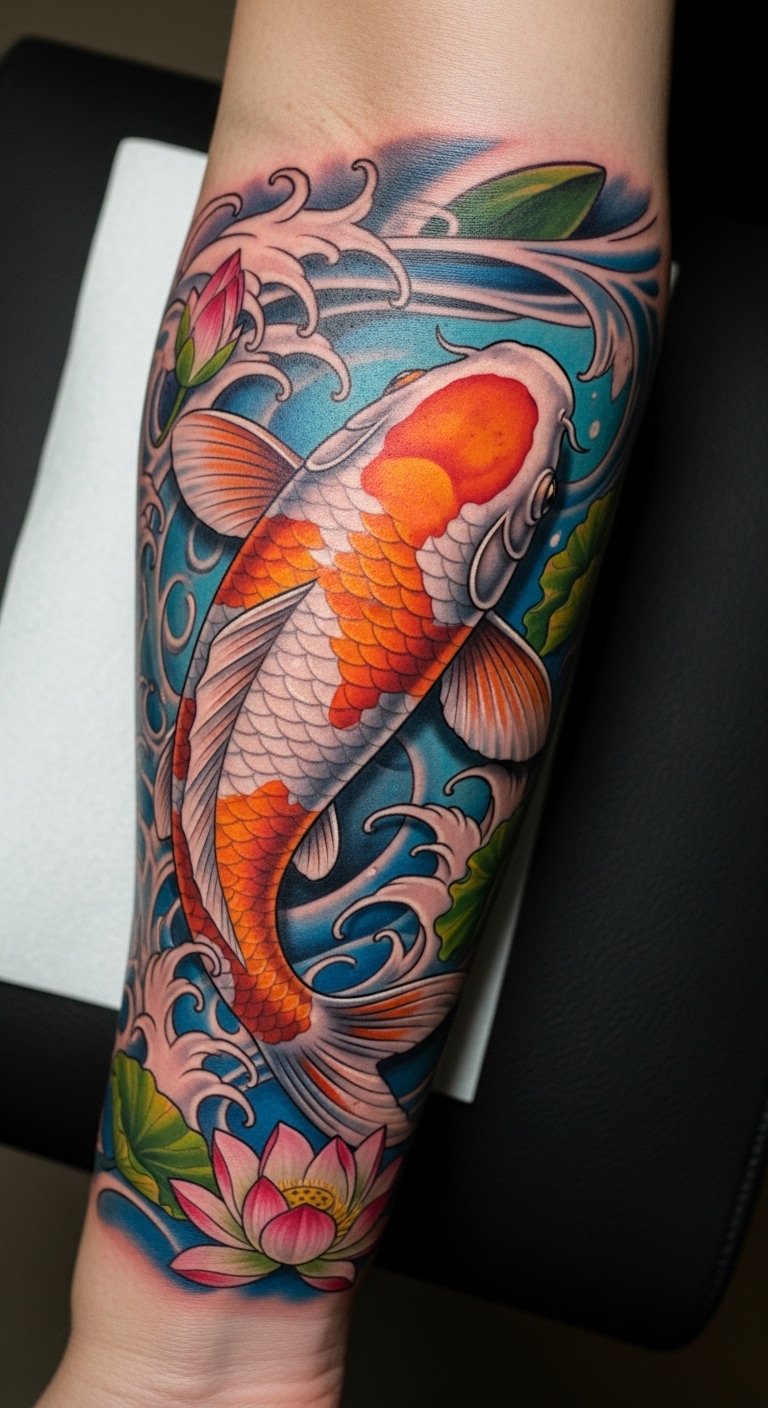 The koi fish tattoo symbolizes perseverance and luck, capturing the essence of overcoming challenges.
