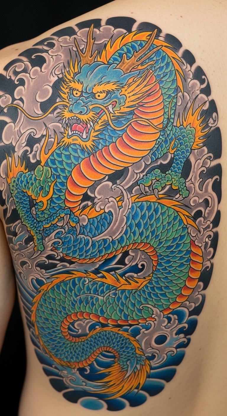 This tattoo design embodies the powerful symbolism of dragons in Japanese culture, representing strength, wisdom, and protection.