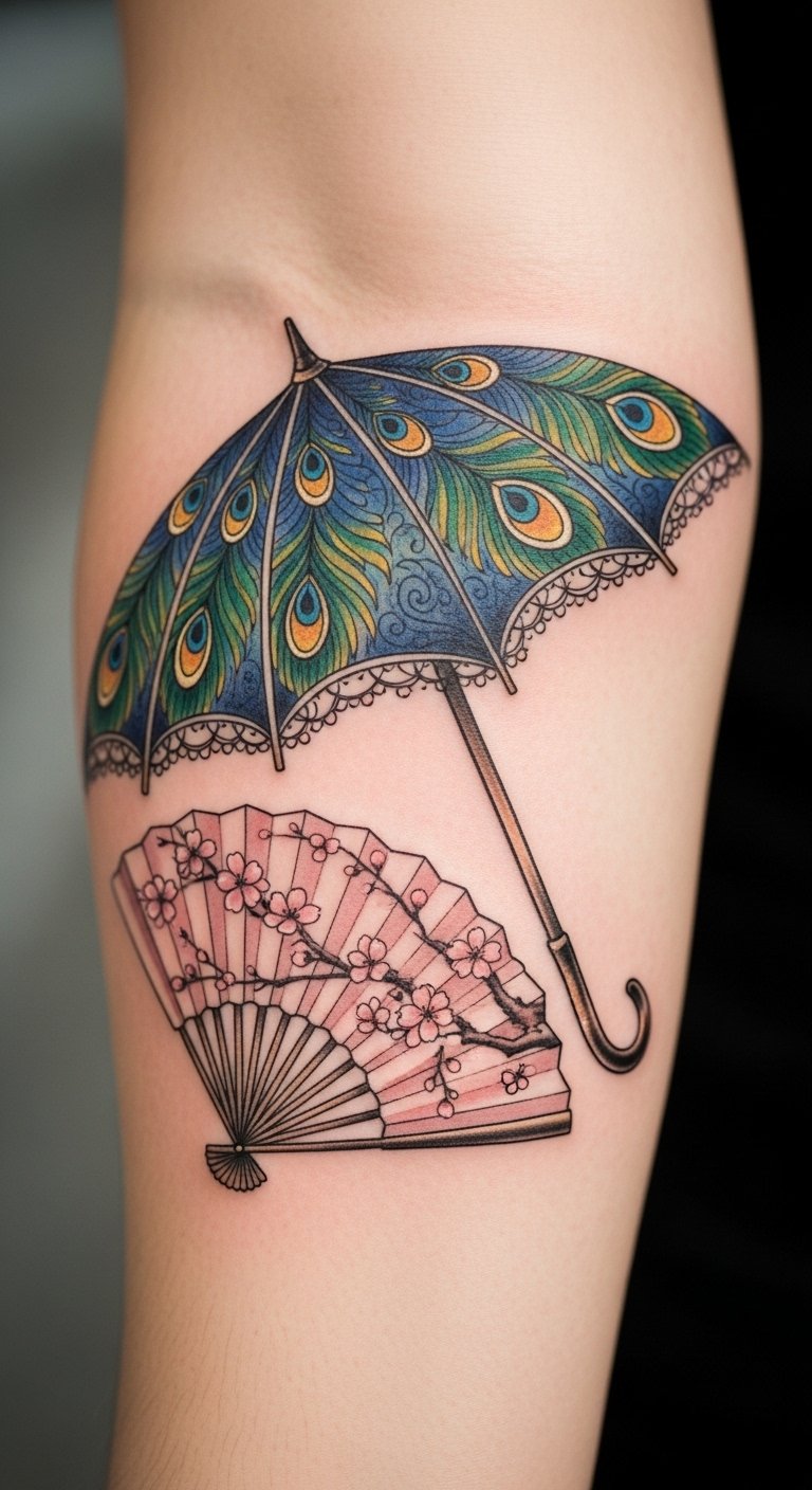 The umbrella and fan together evoke a sense of elegance, embodying the beauty of feminine strength and the delicate balance between tradition and personal expression.