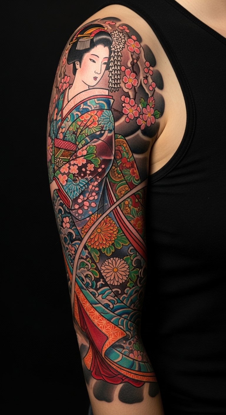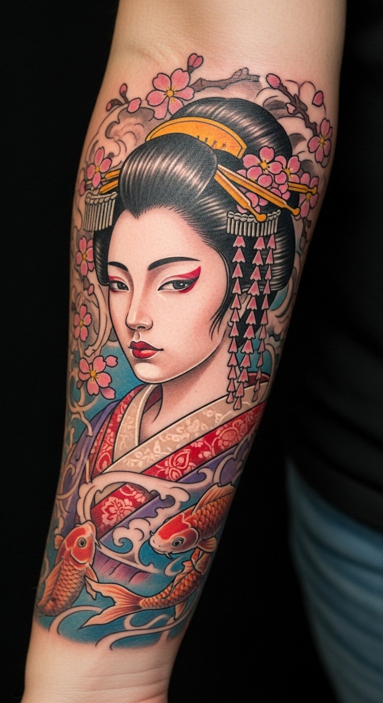 This tattoo symbolizes the harmonious blend of traditional Japanese culture with modern artistry, reflecting the resilience and beauty of the modern geisha.