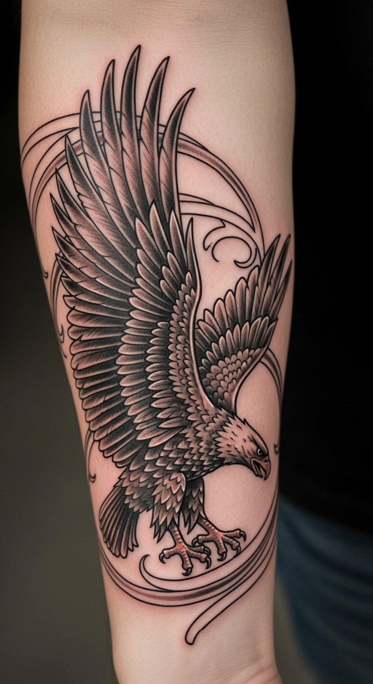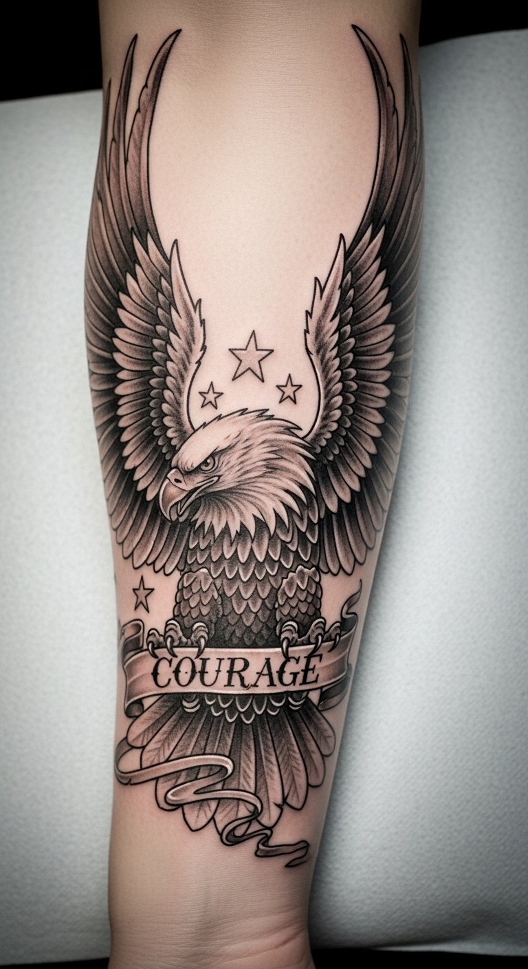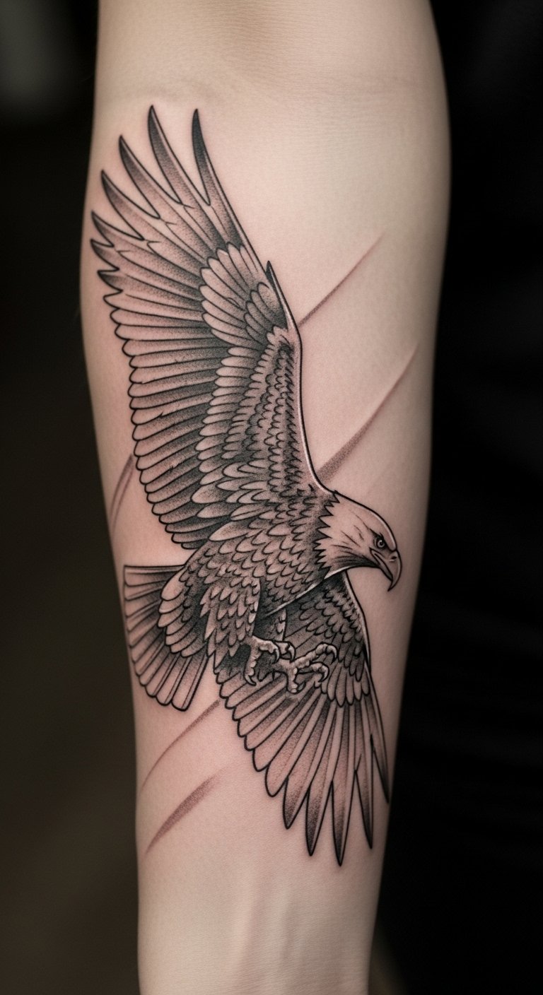 This eagle tattoo, positioned on the forearm, symbolizes courage and the pursuit of freedom.