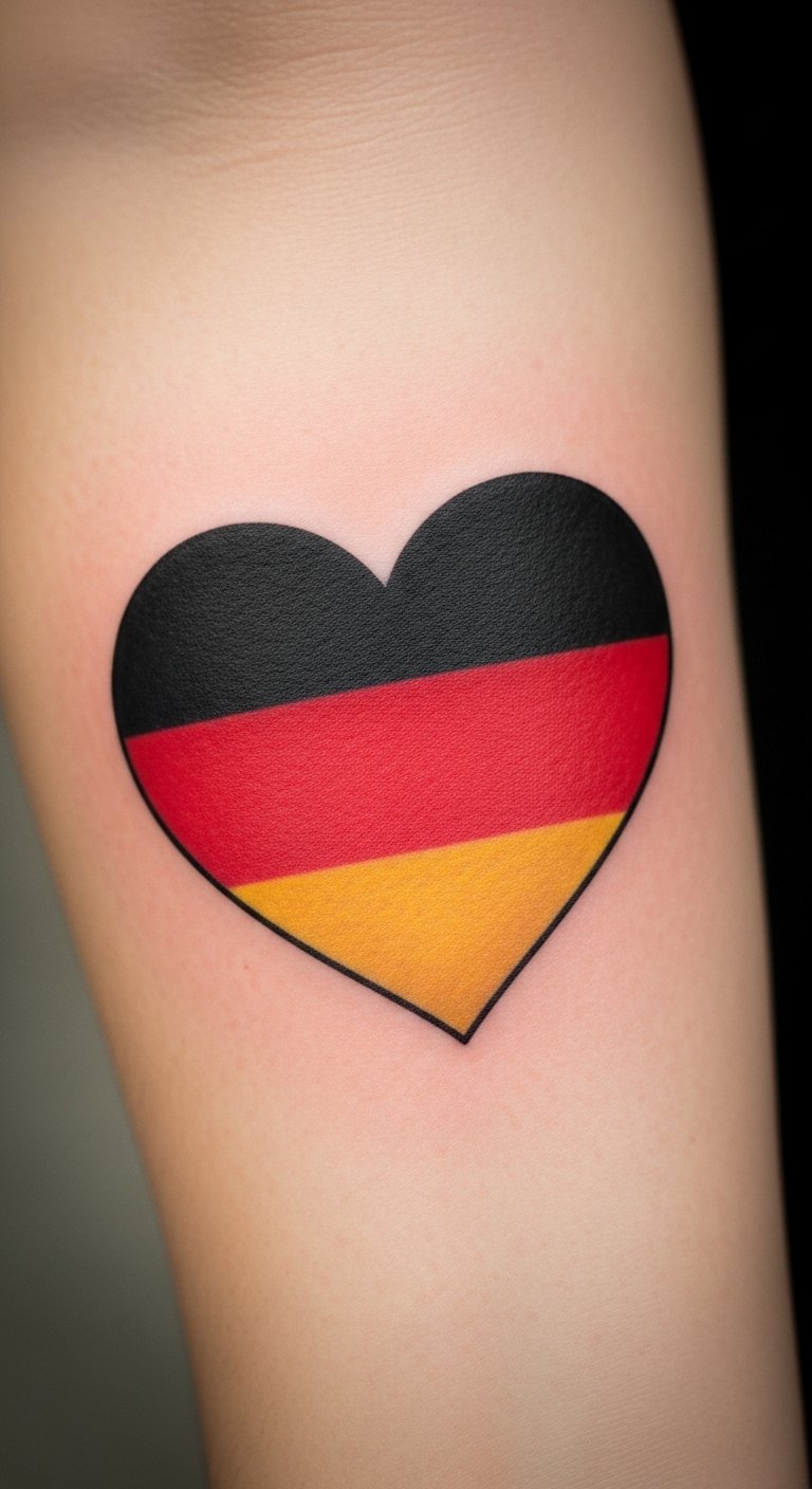 The heart-shaped German flag tattoo symbolizes a deep-rooted love for one’s country, intertwining national pride with personal identity.