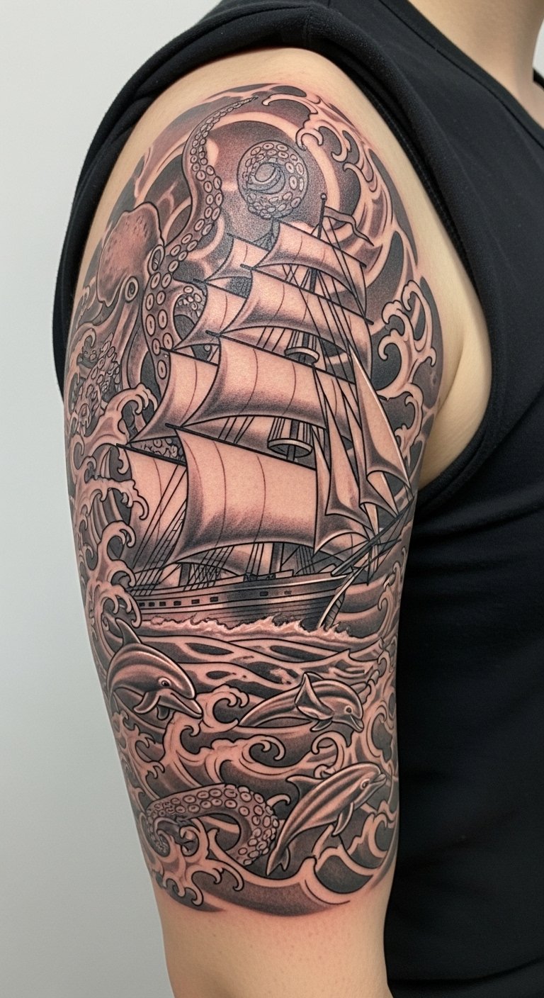 Positioned on the upper arm, this design is both visible and easily concealable, allowing the wearer to express their love for nautical themes in a way that resonates with their personal journey.