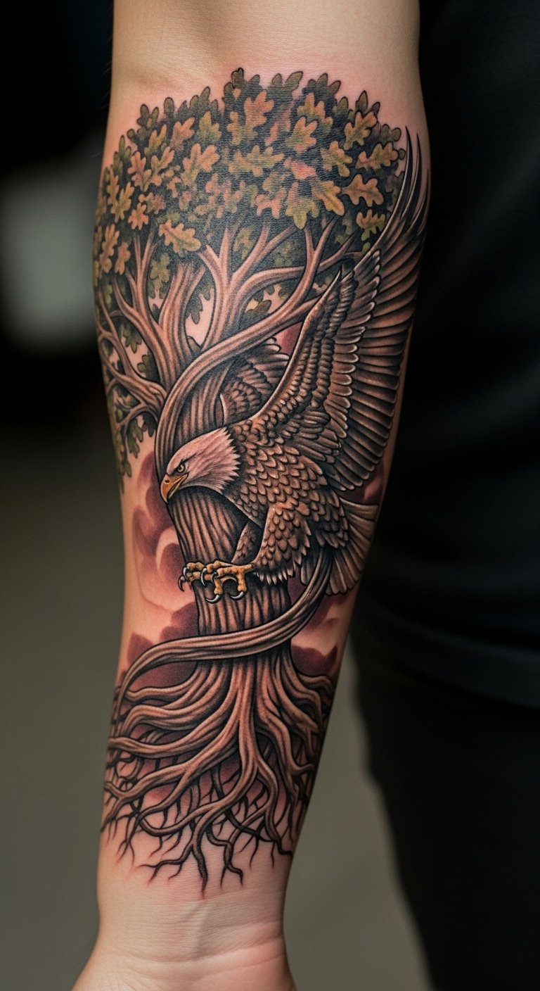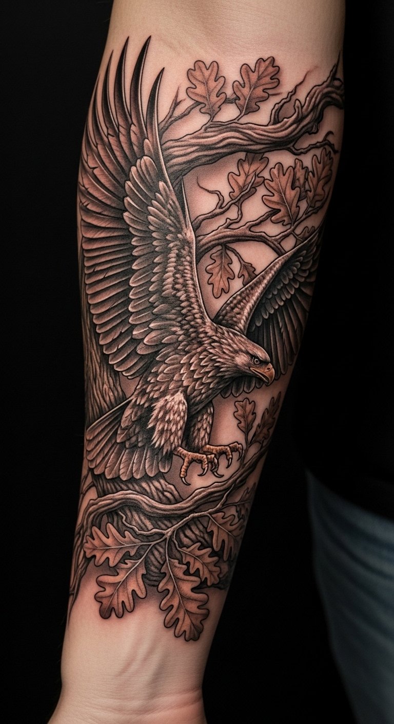 The oak tree symbolizes strength, stability, and rootedness, representing one’s personal journey and heritage, while the German eagle embodies courage and resilience. Placed on the forearm, this tattoo serves as a constant reminder of one’s roots and the strength derived from cultural identity. The visibility of the design allows for personal expression and connection, inviting conversations about its deep meaning and the stories behind them. It becomes more than just a visual art piece; it transforms into a narrative of life experiences and values.