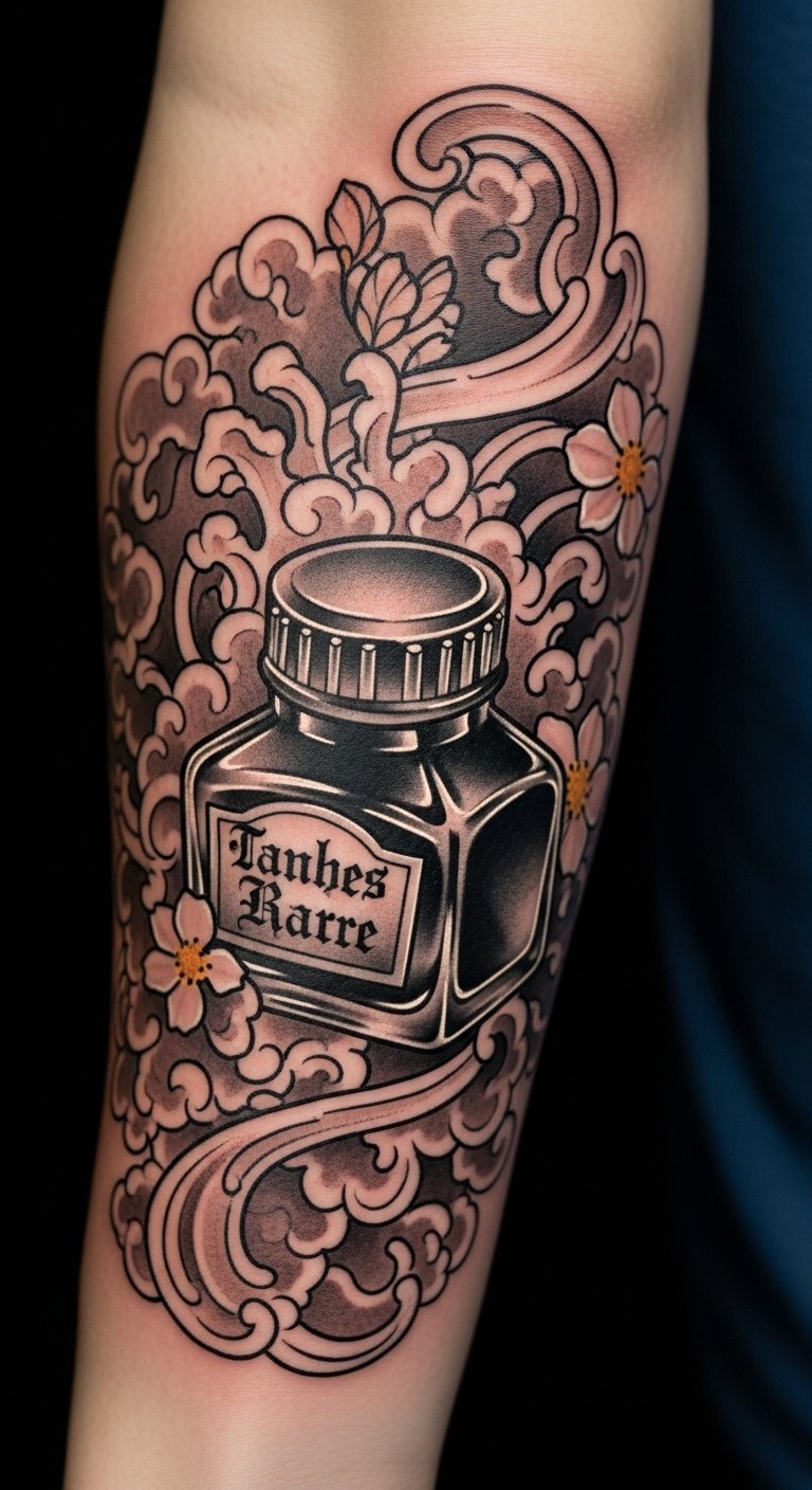 The ink bottle represents the tools of the trade, while the swirling clouds suggest the fluidity of artistic expression. Flowers add a layer of beauty and represent personal growth and transformation, making this tattoo a celebration of one’s unique story.