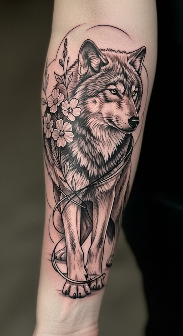 This tattoo embodies the powerful symbolism of loyalty and resilience, with the wolf representing steadfastness and the wildflowers signifying strength in adversity.