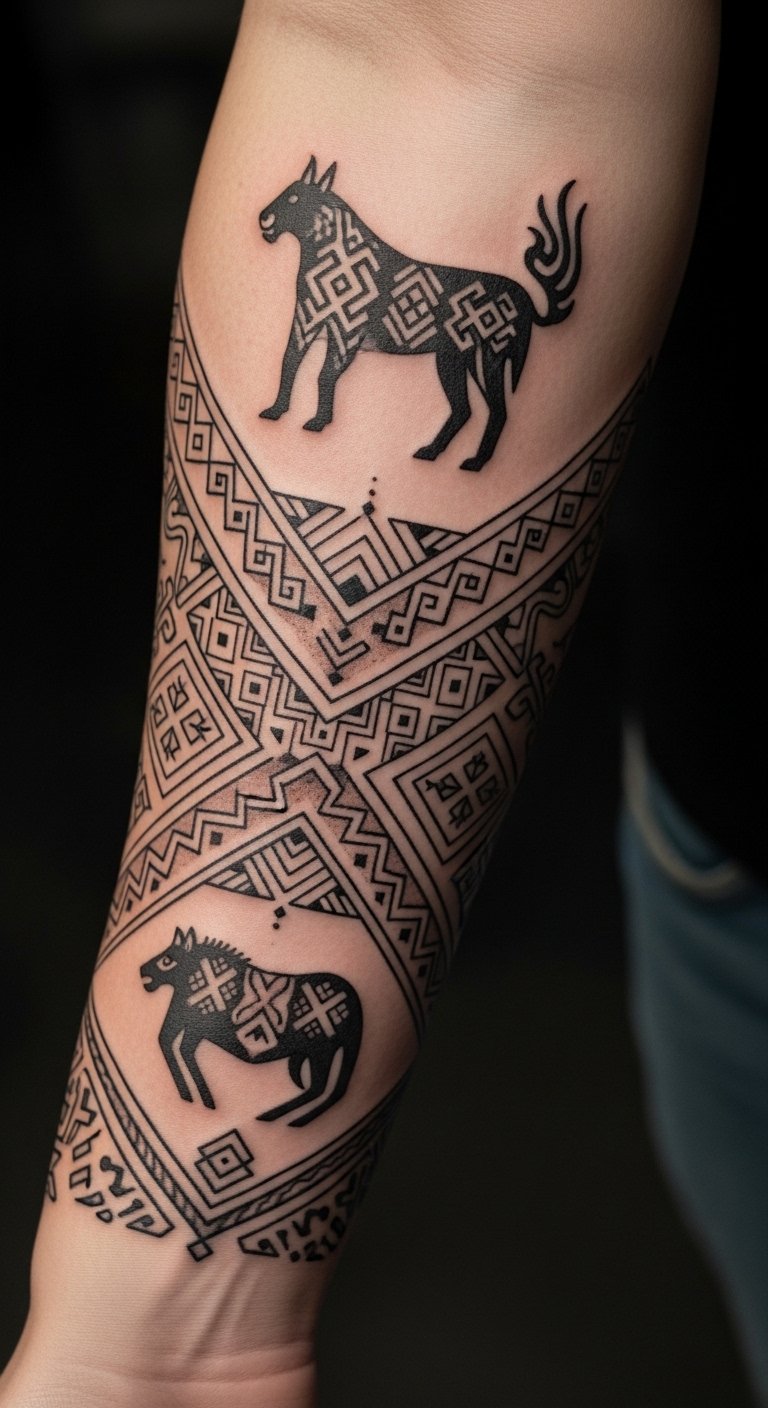 The intricate patterns and animal symbols evoke a sense of bravery and heritage, transforming the skin into a canvas of cultural exchange, making a powerful statement about identity and resilience.