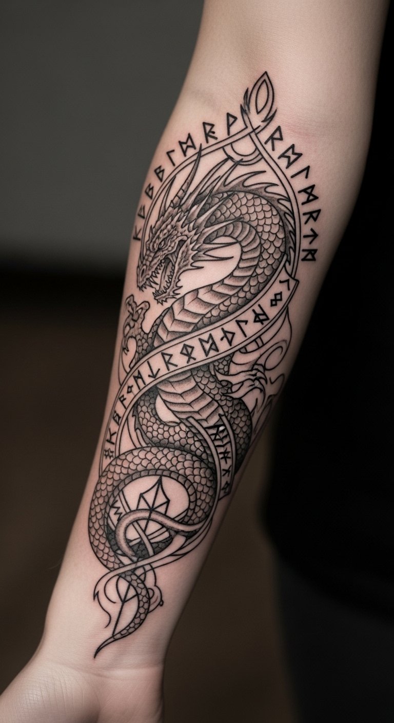 This tattoo concept embodies the essence of mythical strength and protection, with the dragon representing power and the runes serving as a safeguard for the wearer.