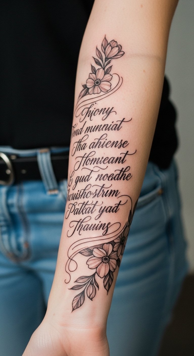 This tattoo symbolizes personal growth and the journey of life, with the flowing script representing the fluidity of experiences that shape identity.