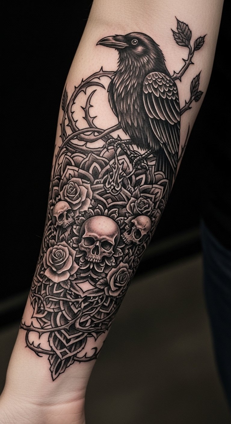 Placed on the forearm, it serves as a constant reminder of one’s inner shadows, making it both a personal narrative and a striking visual statement.