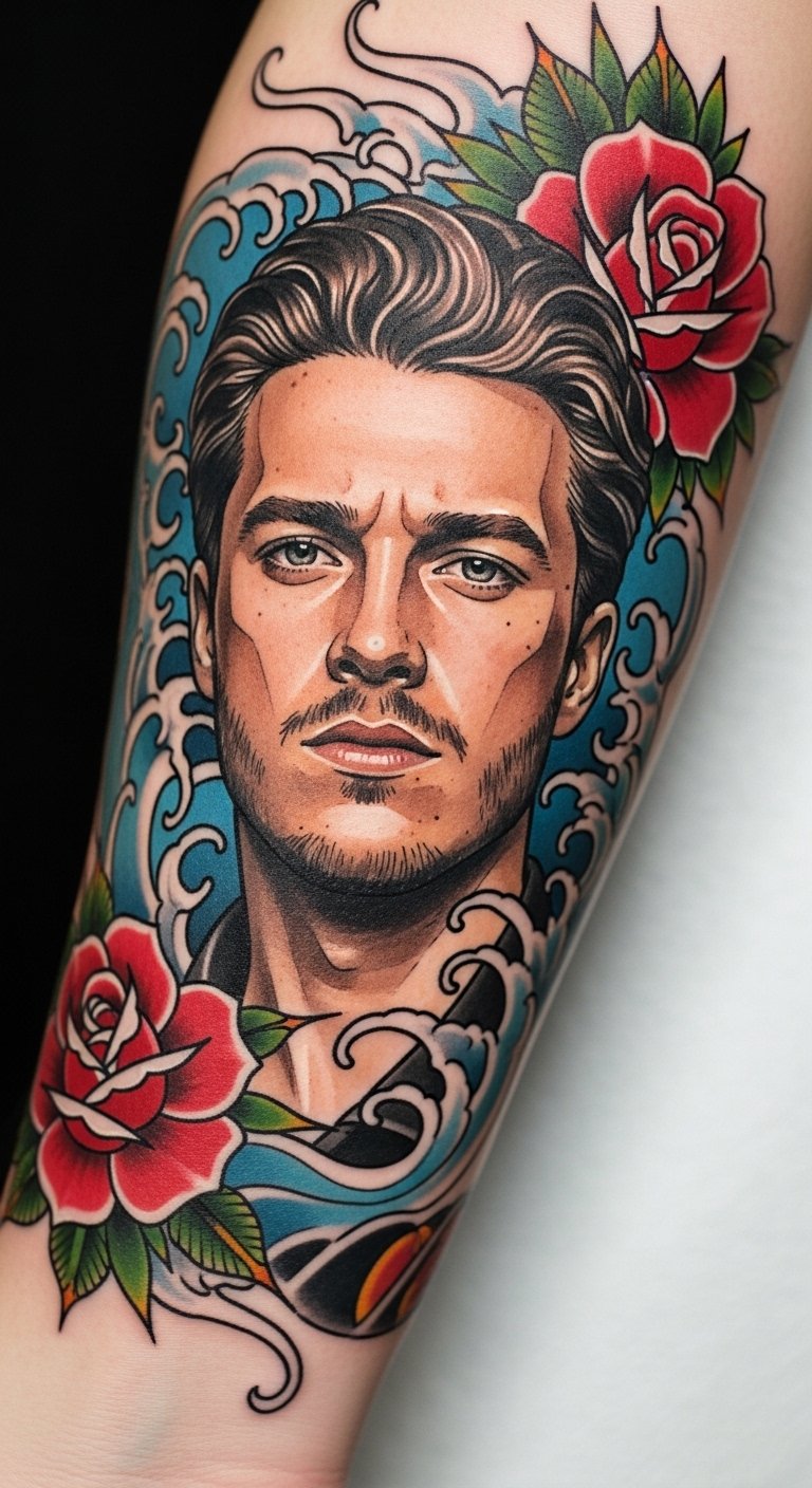 Placed on the forearm, it serves as a visible reminder of one’s connection to the art form and its rich legacy. The roses signify beauty and resilience, while the waves represent the ebb and flow of creativity and inspiration.