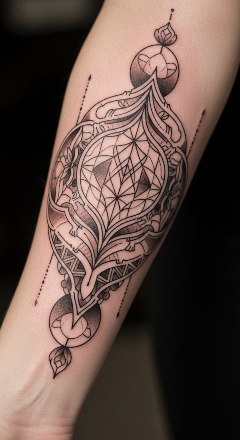 This tattoo design on the forearm symbolizes the wearer’s journey through life, with each geometric shape representing a different milestone or aspiration.