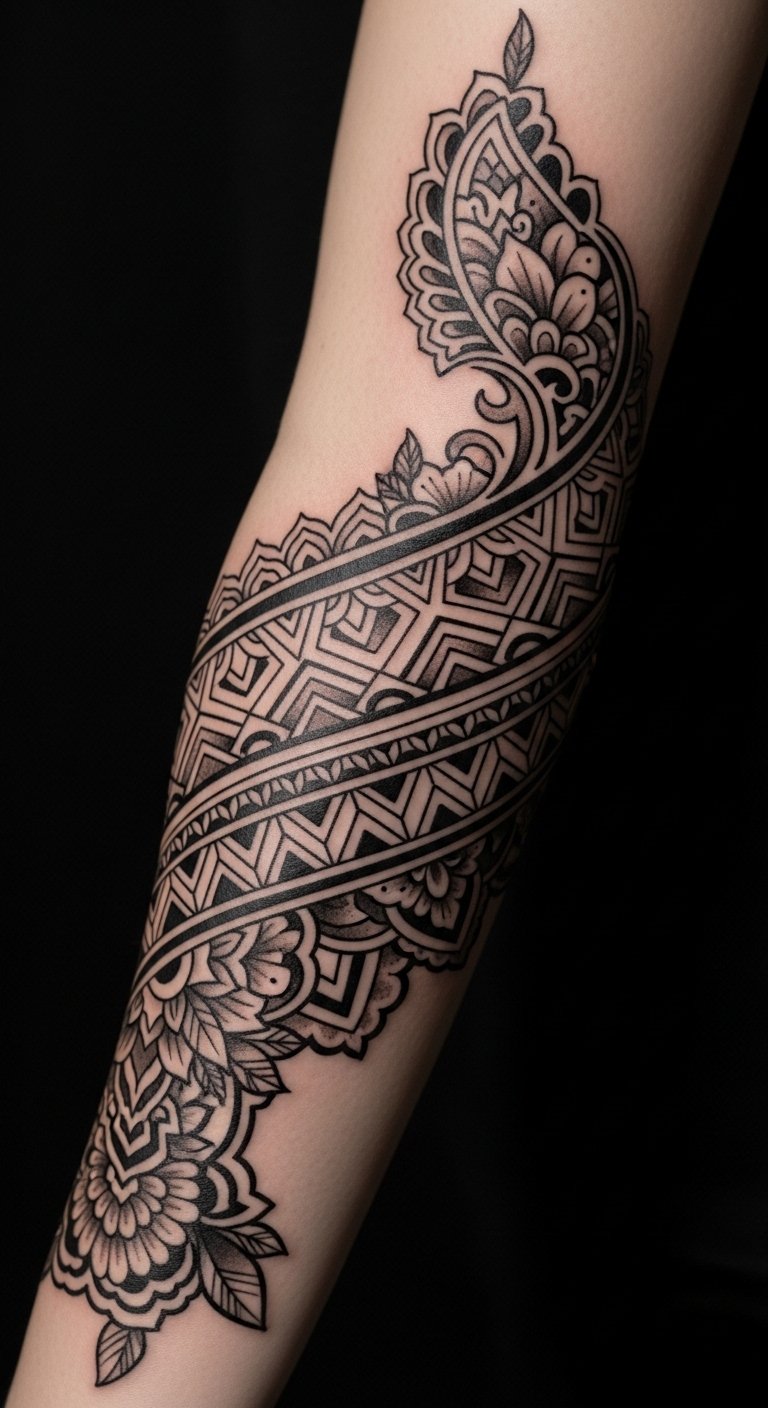 The tribal patterns evoke a sense of heritage, celebrating the rich history and identity of those who wear them. Placed on the forearm, the design is easily visible, allowing the wearer to share their story and cultural pride with others, while also serving as a personal reminder of resilience and freedom.