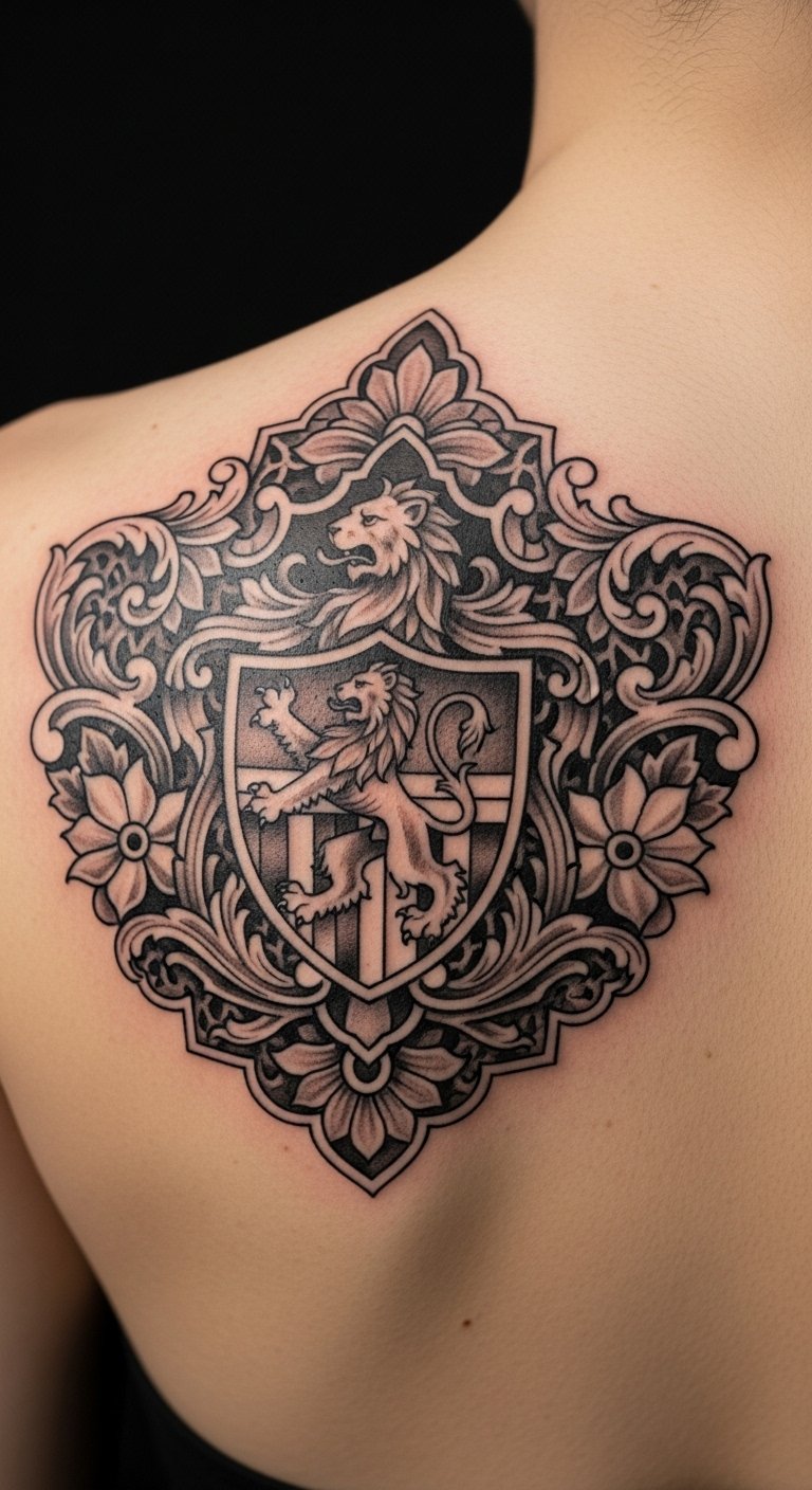 This tattoo serves as a powerful heritage symbolism, celebrating your family lineage through the majestic imagery of a lion, representing strength and courage.