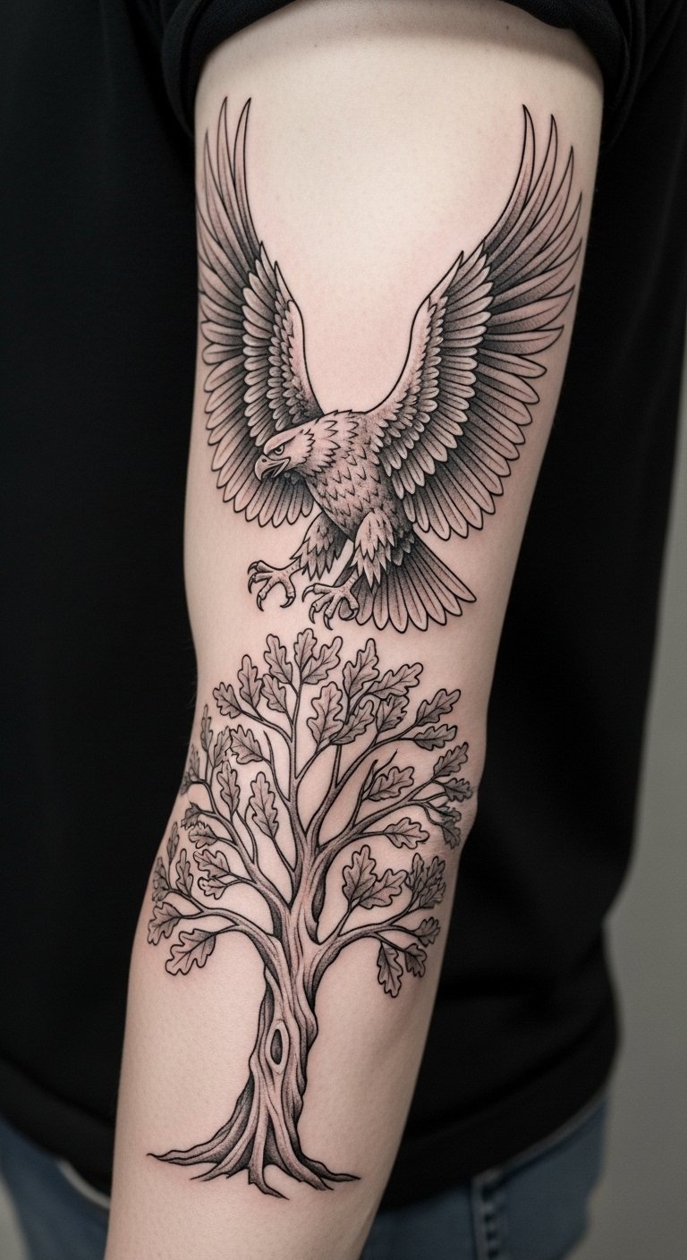 This tattoo design embodies a powerful narrative of identity and heritage. The German eagle signifies a connection to one’s roots, representing bravery and pride, while the oak tree stands for stability and endurance through life’s challenges.