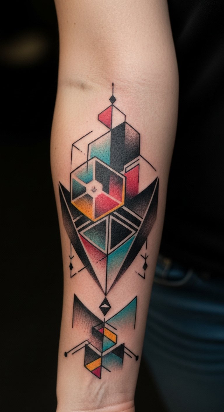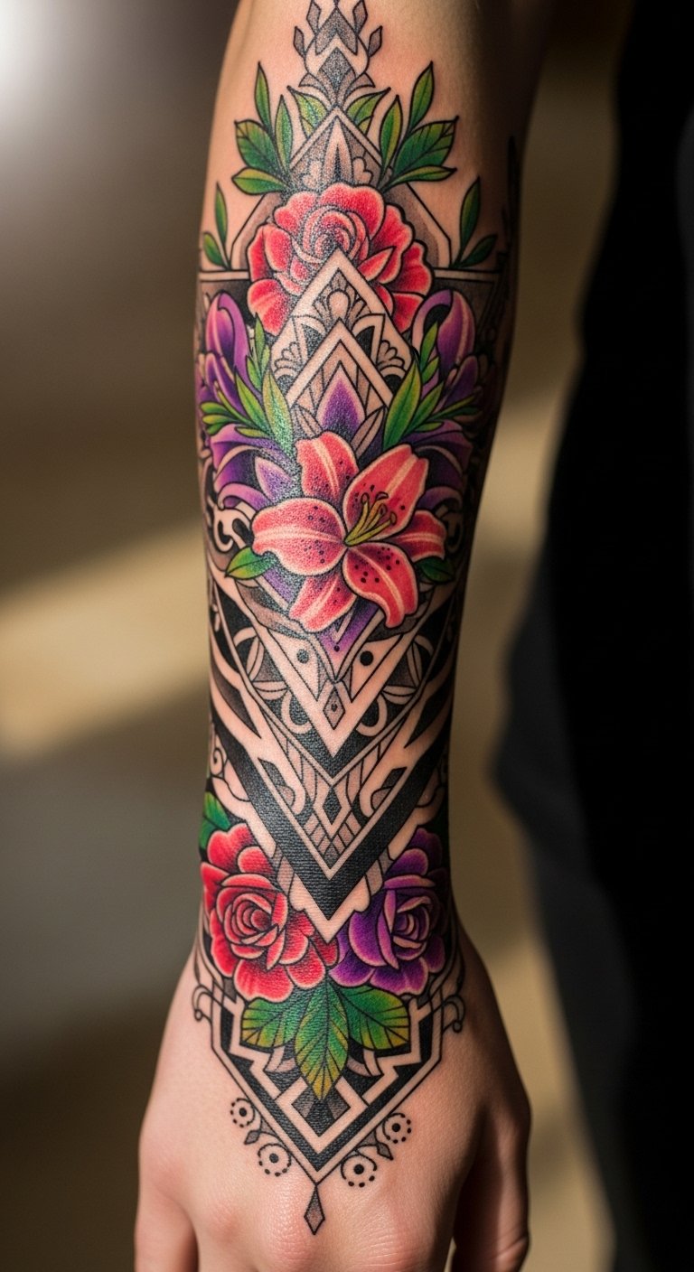 The geometric shapes symbolize balance and harmony, reflecting a deep connection to one’s inner self. Positioned on the forearm, it serves as a constant reminder of personal power, allowing the wearer to express her unique identity while also inviting curiosity and conversation.