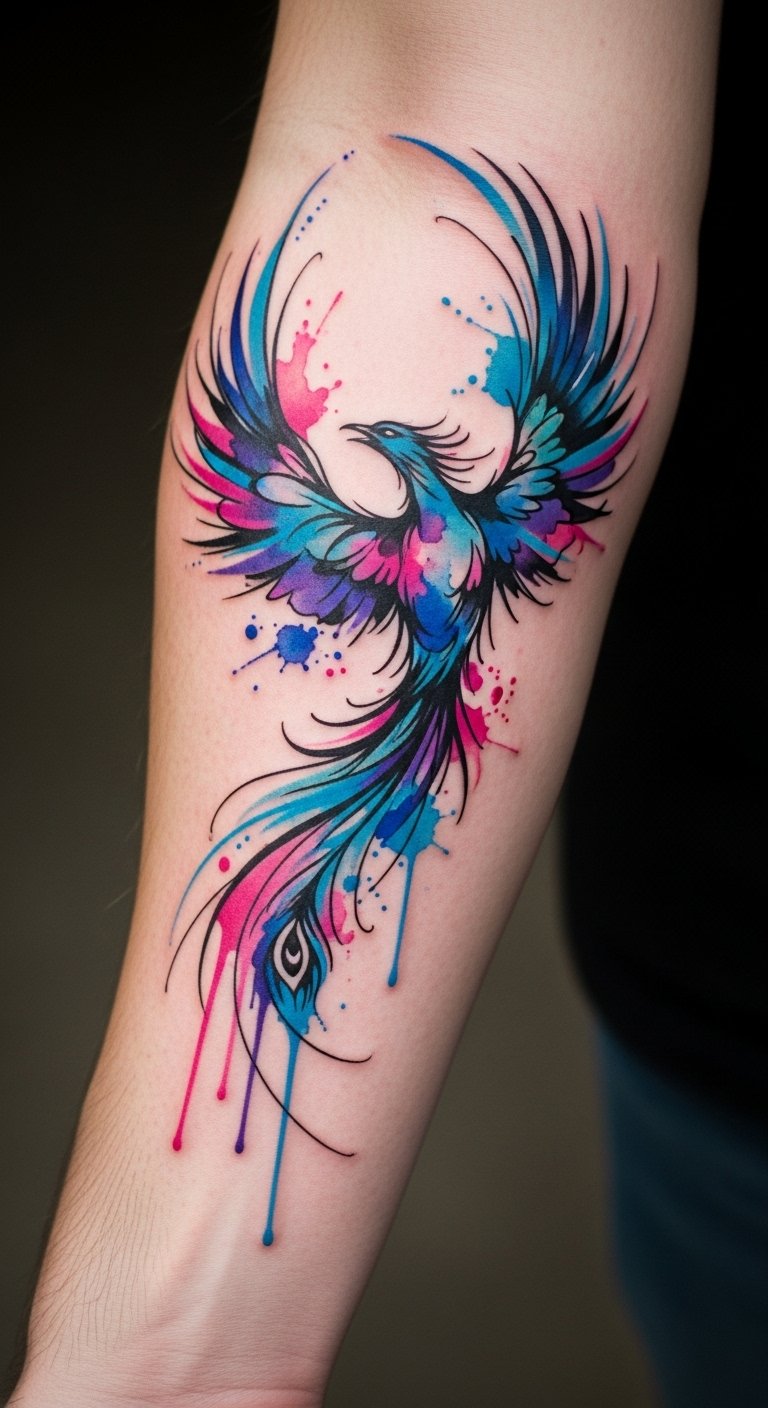 This tattoo design symbolizes rebirth and resilience, with the phoenix representing transformation and the ability to rise from challenges.