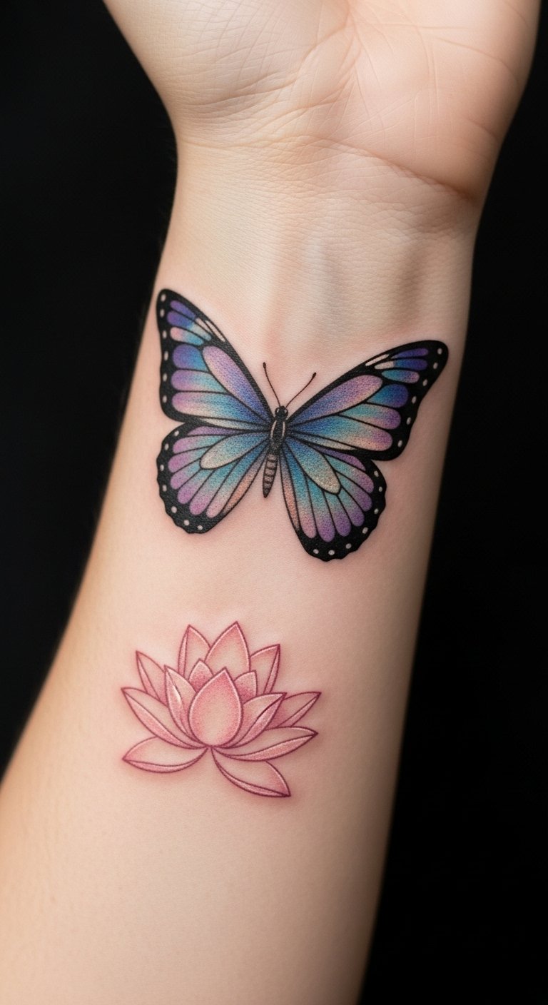 The butterfly signifies a profound transformation, embodying the beauty of change and personal growth, while the lotus represents purity and the ability to rise above challenges.