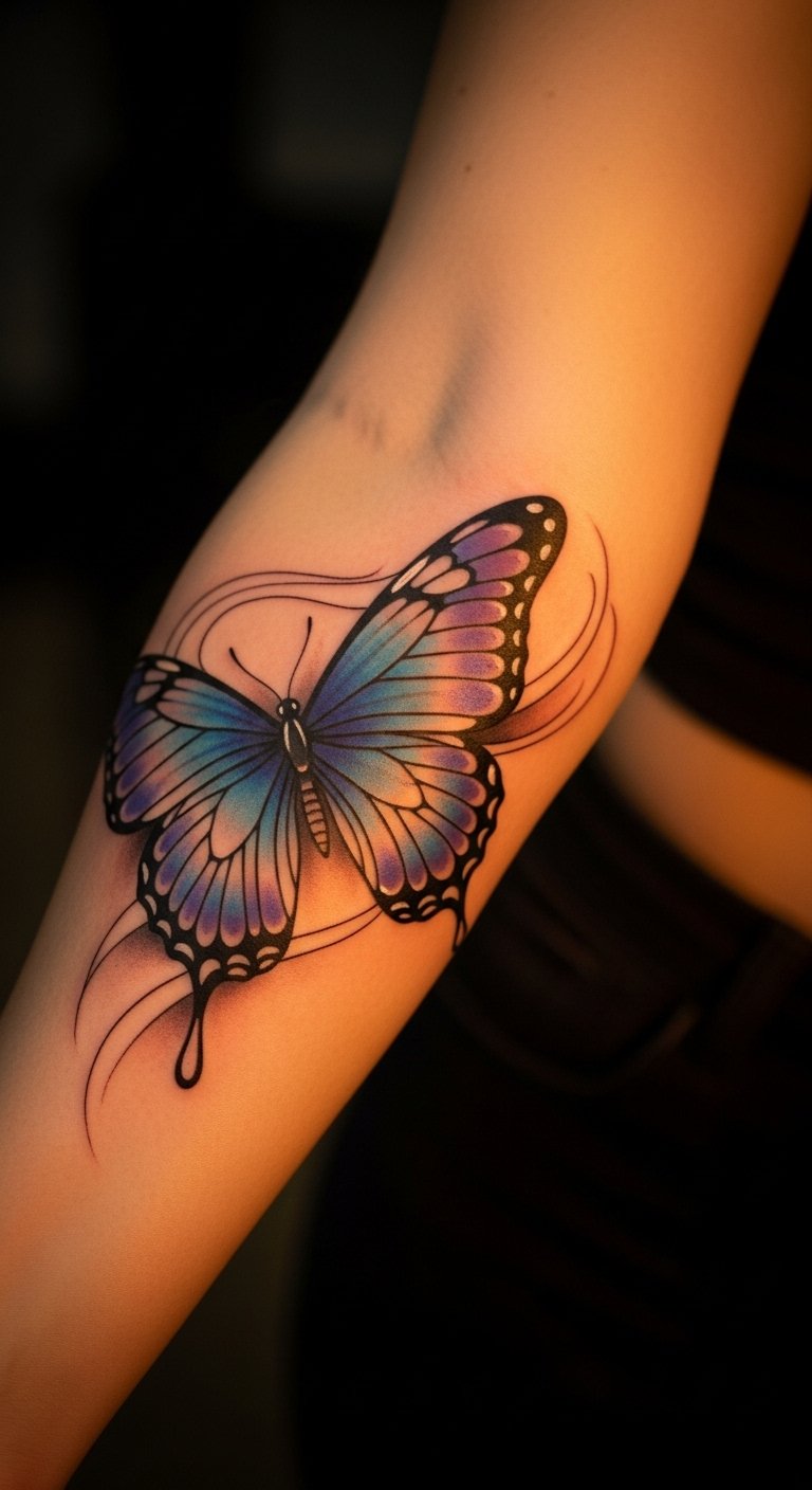 This butterfly tattoo symbolizes transformation and personal growth, embodying the journey of resilience and freedom.