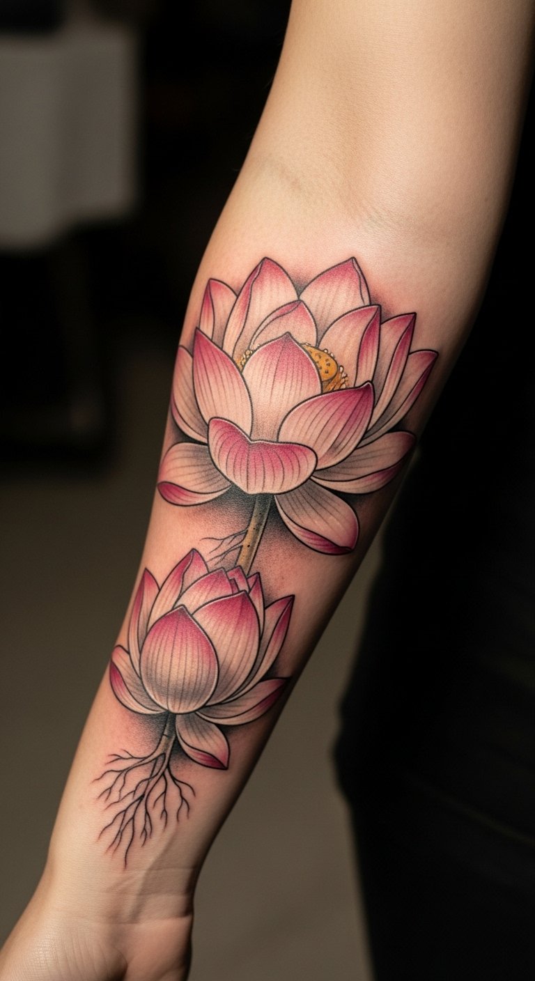 This tattoo design symbolizes growth and beauty, reflecting a personal journey intertwined with nature.
