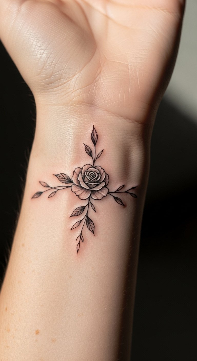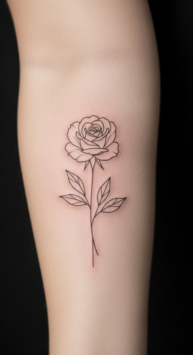 This rose tattoo symbolizes femininity and personal growth, elegantly embodying the wearer’s journey of strength and resilience.