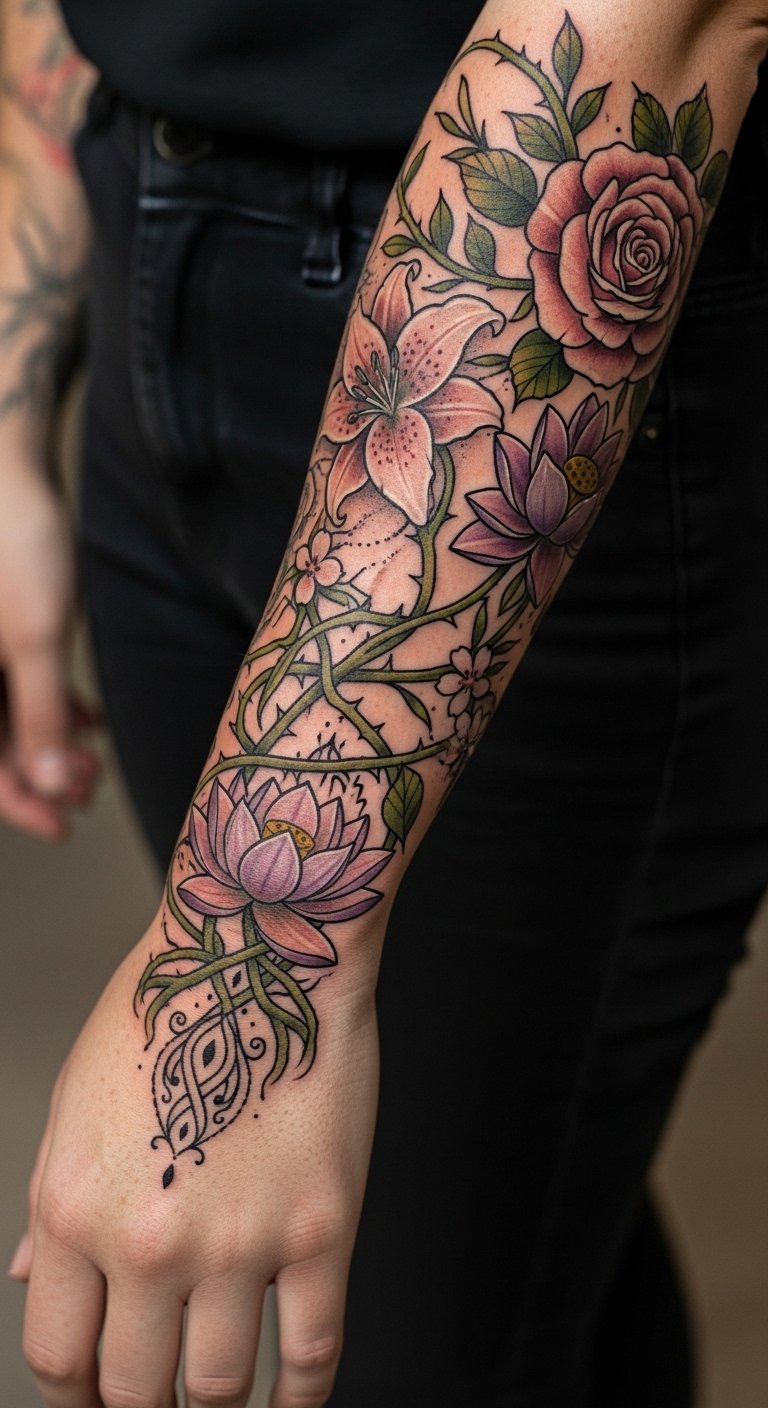 The placement on the forearm allows for visibility, inviting admiration and sparking conversations about the personal stories behind the flowers.