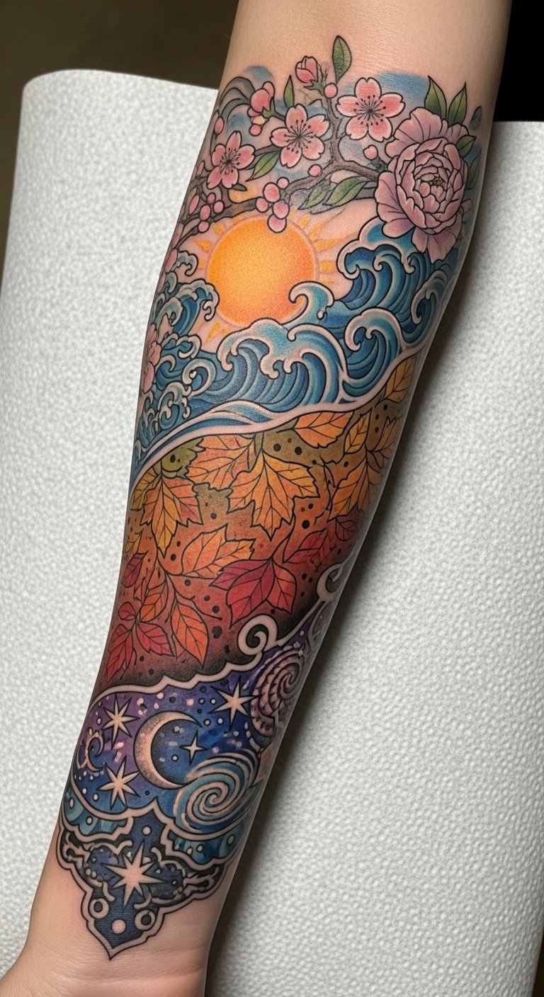 This tattoo concept flows beautifully along the forearm, symbolizing the cyclical nature of life and the ever-changing seasons.