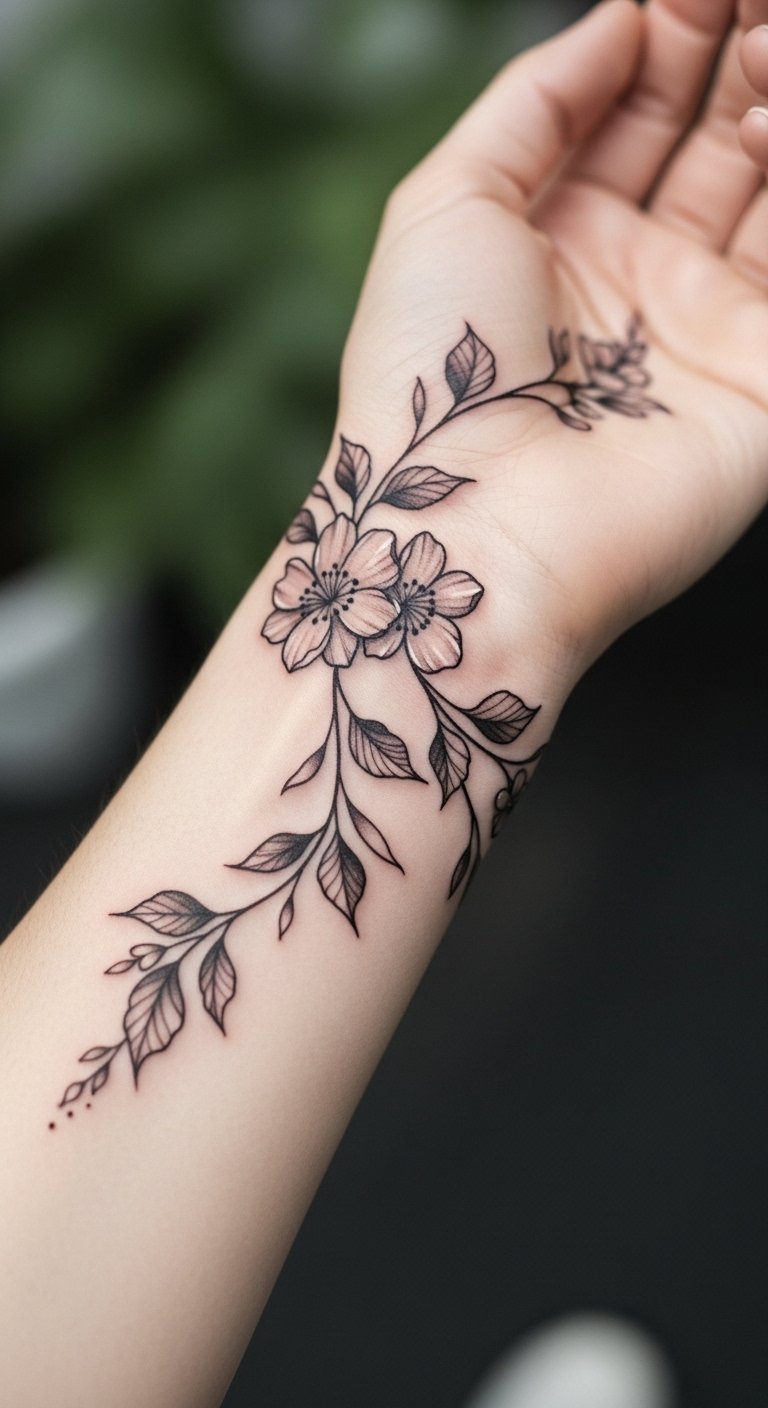 This tattoo symbolizes growth, resilience, and the beauty of nature. The intertwining vines represent the journey of life, while the flowers embody personal aspirations and the blossoming of one’s true self. Placed on the wrist and forearm, it remains visible yet intimate, allowing the wearer to carry their story with them wherever they go, serving as a reminder of their strength and individuality.