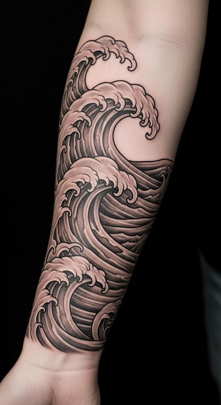 The flowing waves signify the strength needed to navigate life’s challenges, while the placement on the forearm allows for visibility and easy expression of identity.