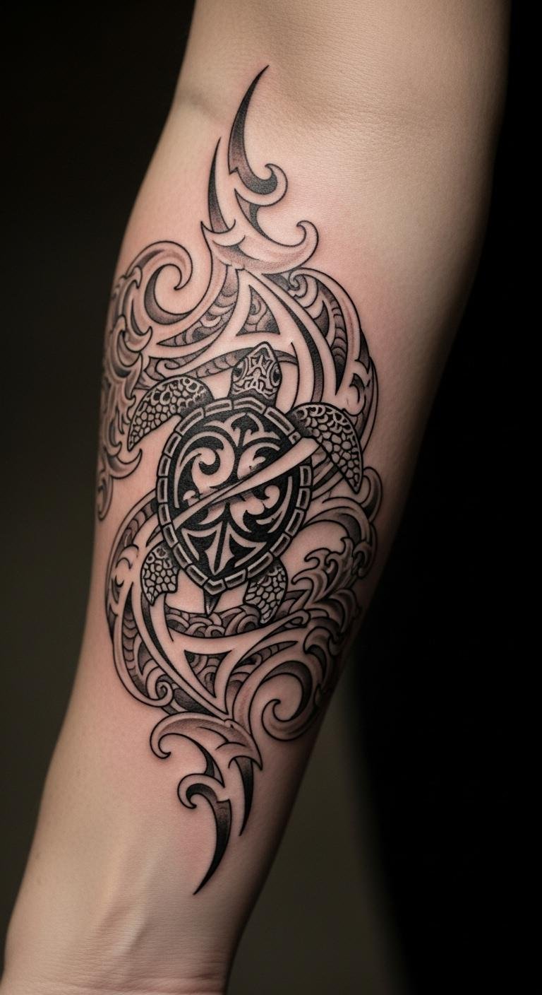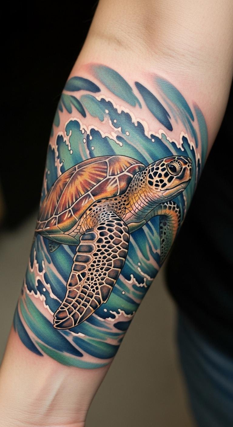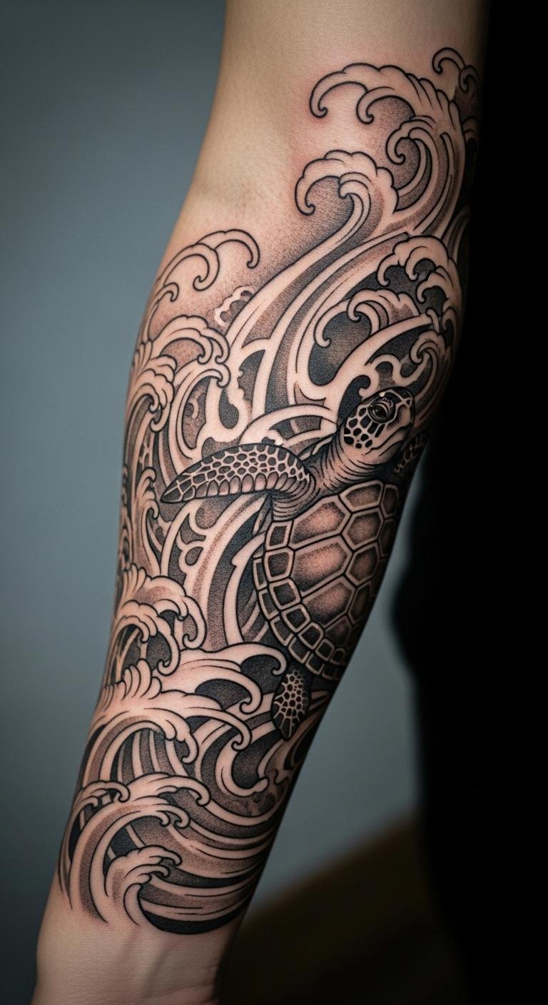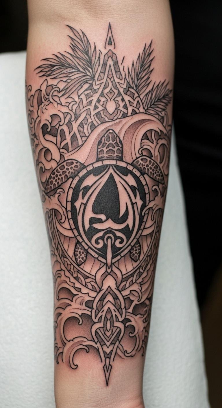 This tattoo embodies the essence of Hawaiian culture, where waves symbolize the endless flow of life and the turtle represents strength and perseverance.