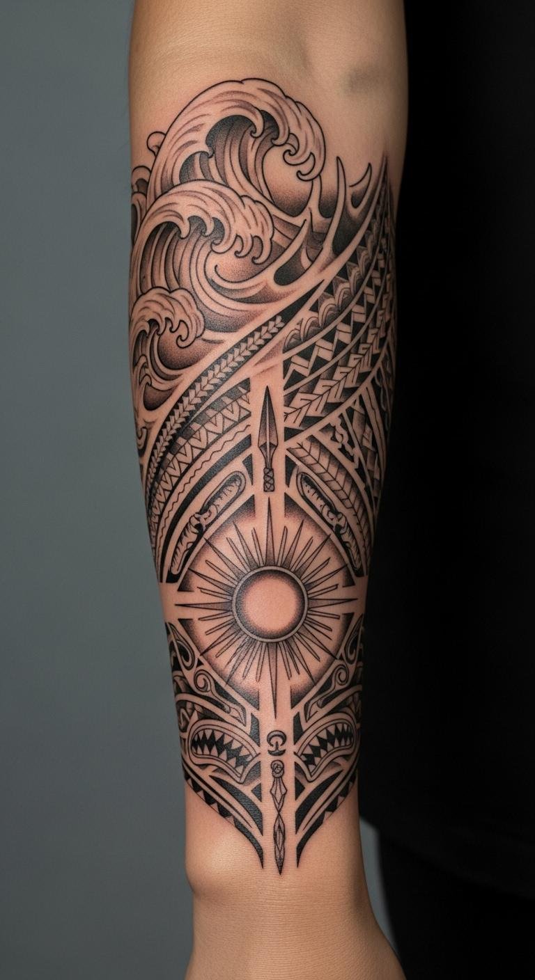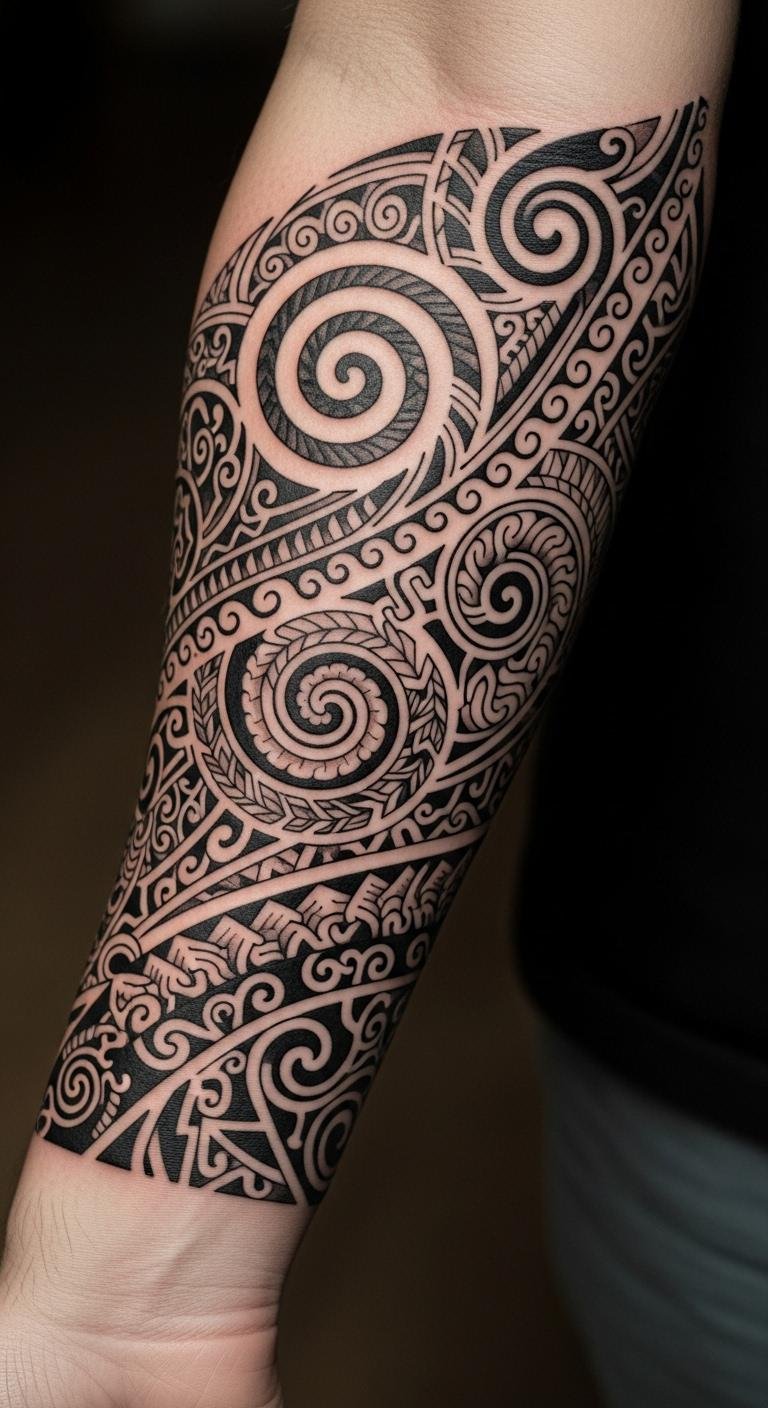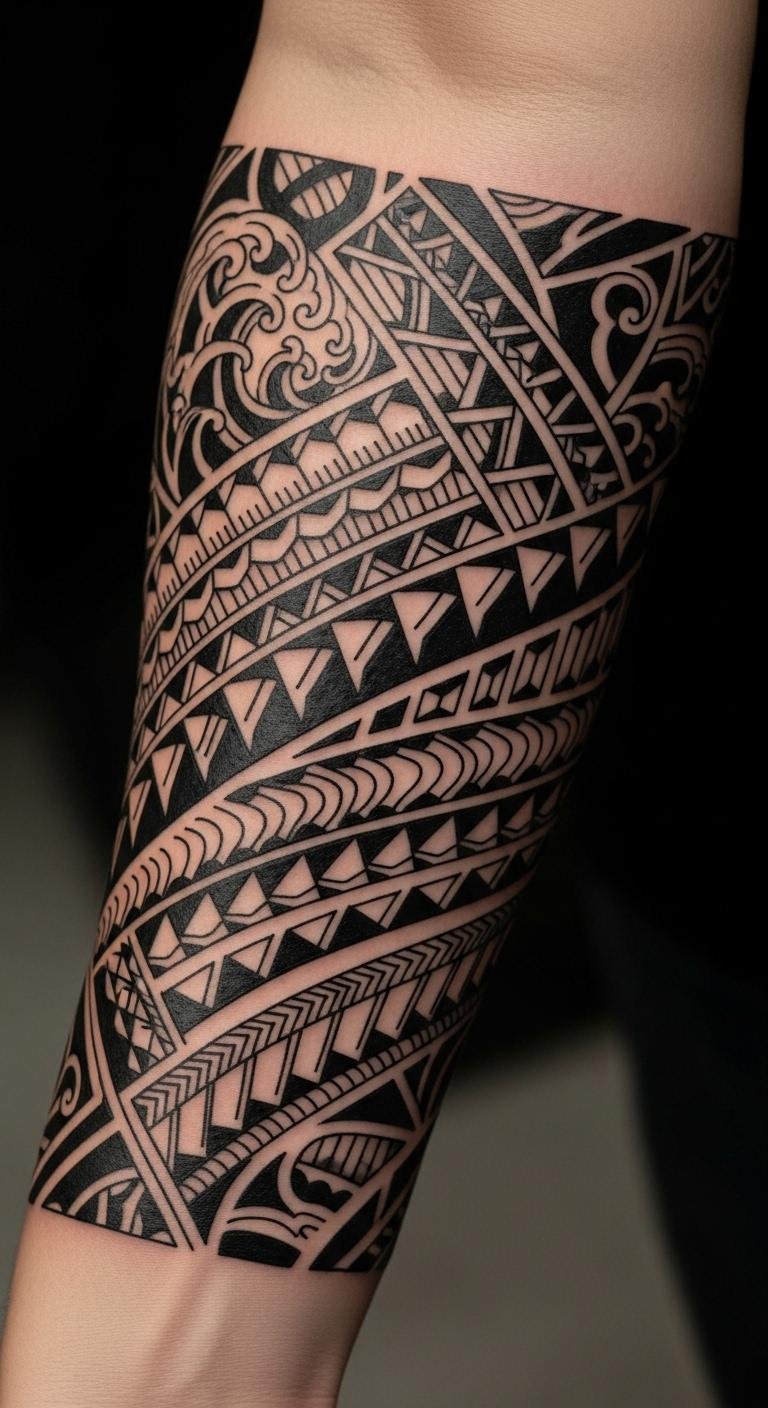 Positioned on the forearm, it serves as a constant reminder of one’s identity and heritage. The flowing lines and shapes not only celebrate Polynesian artistry but also symbolize freedom, unity, and a deep connection to nature.