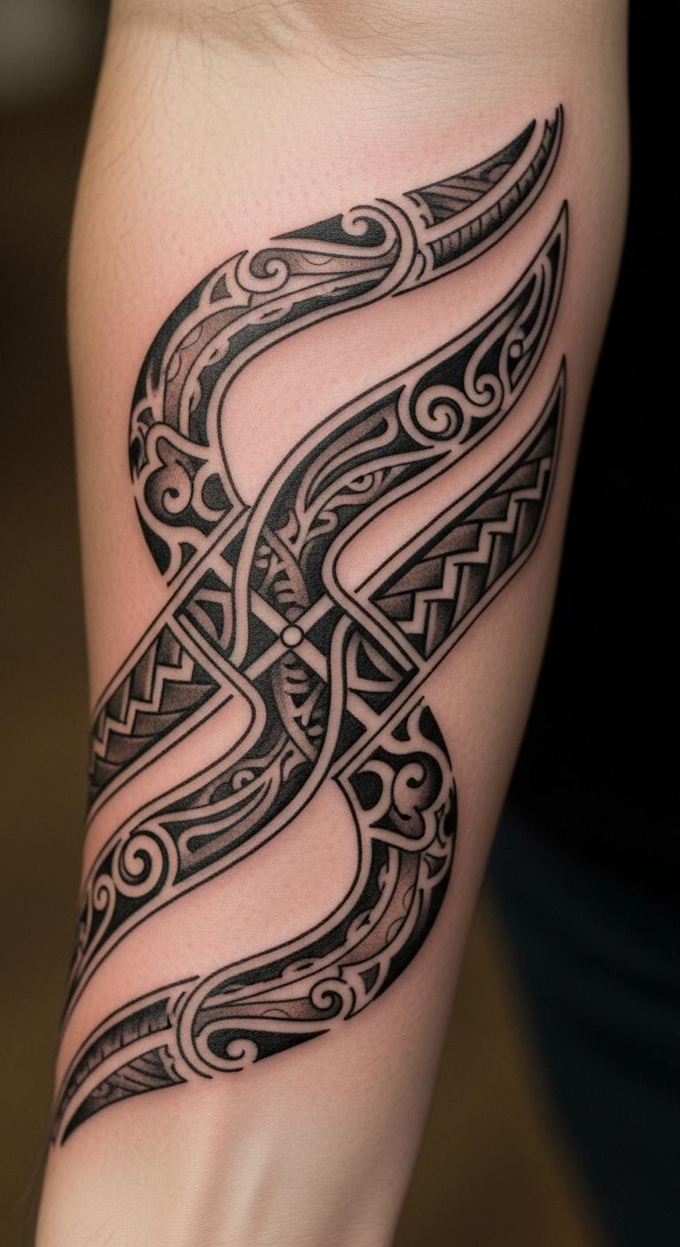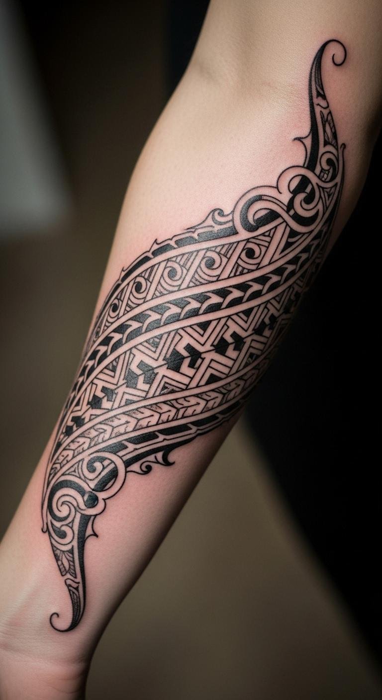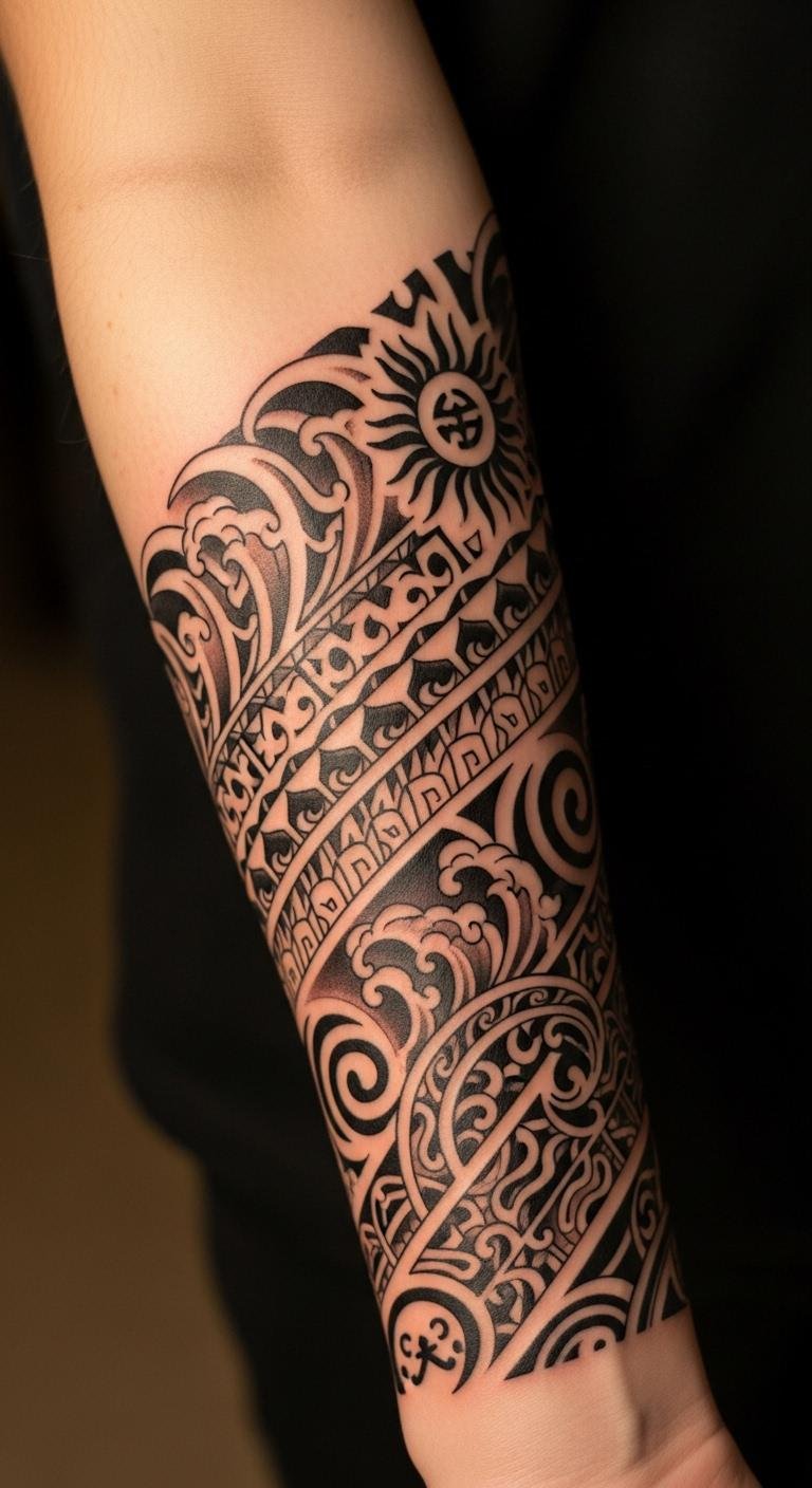 Positioned on the forearm, it serves as a constant reminder of one’s identity and heritage. The flowing lines and shapes not only celebrate Polynesian artistry but also symbolize freedom, unity, and a deep connection to nature.