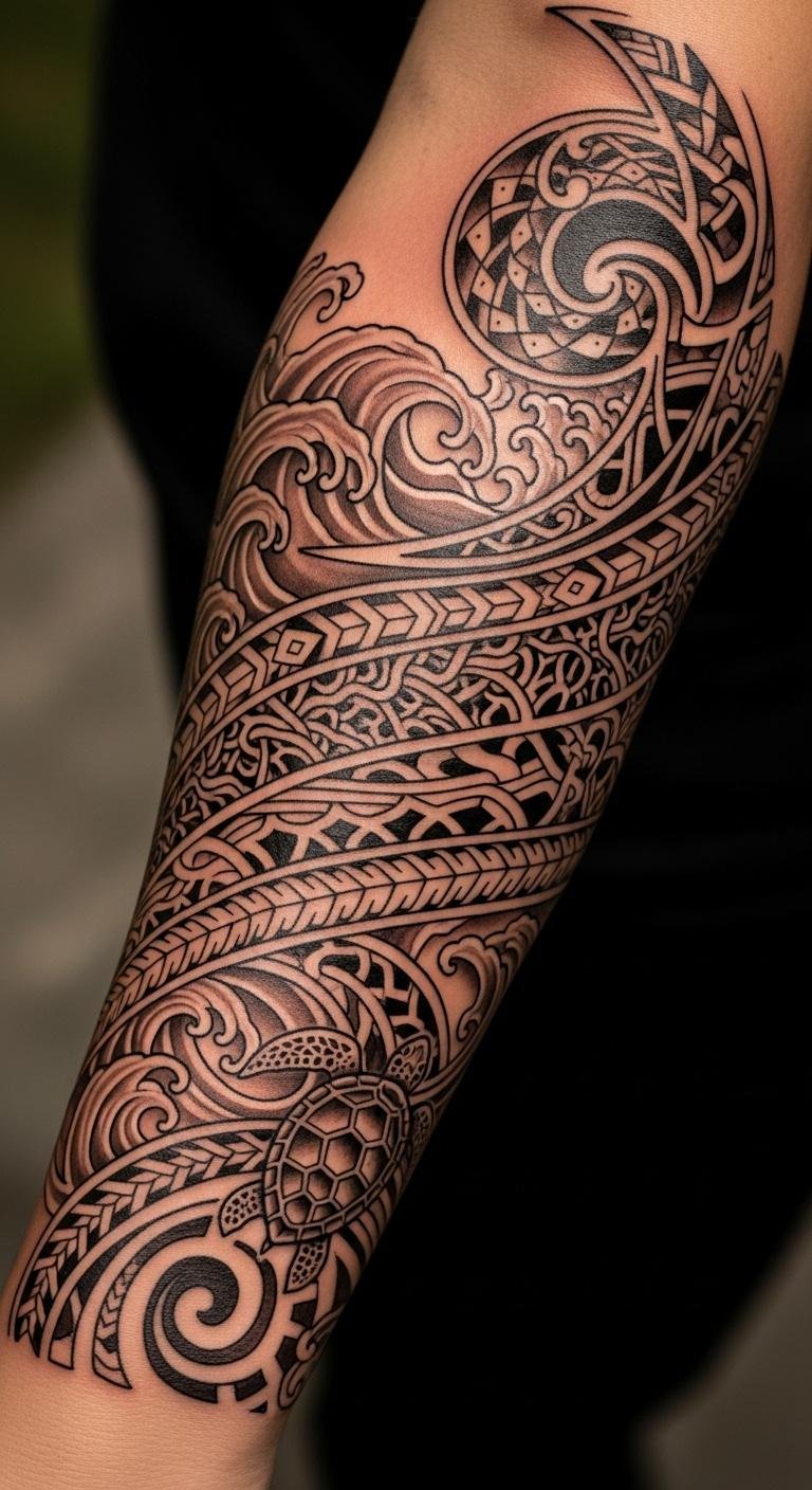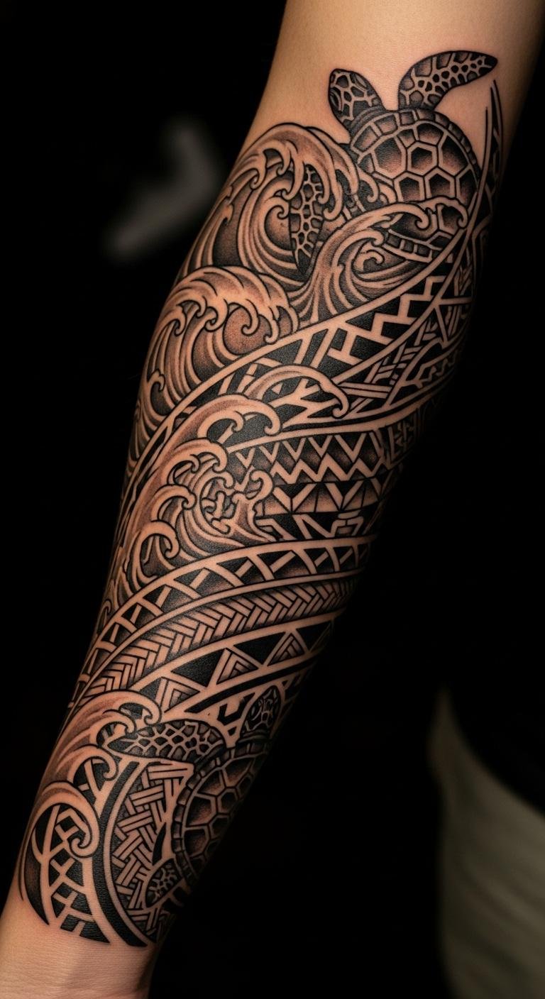 This tattoo embodies the essence of Hawaiian culture, representing a connection to the ocean and nature, symbolized by the waves and turtle.