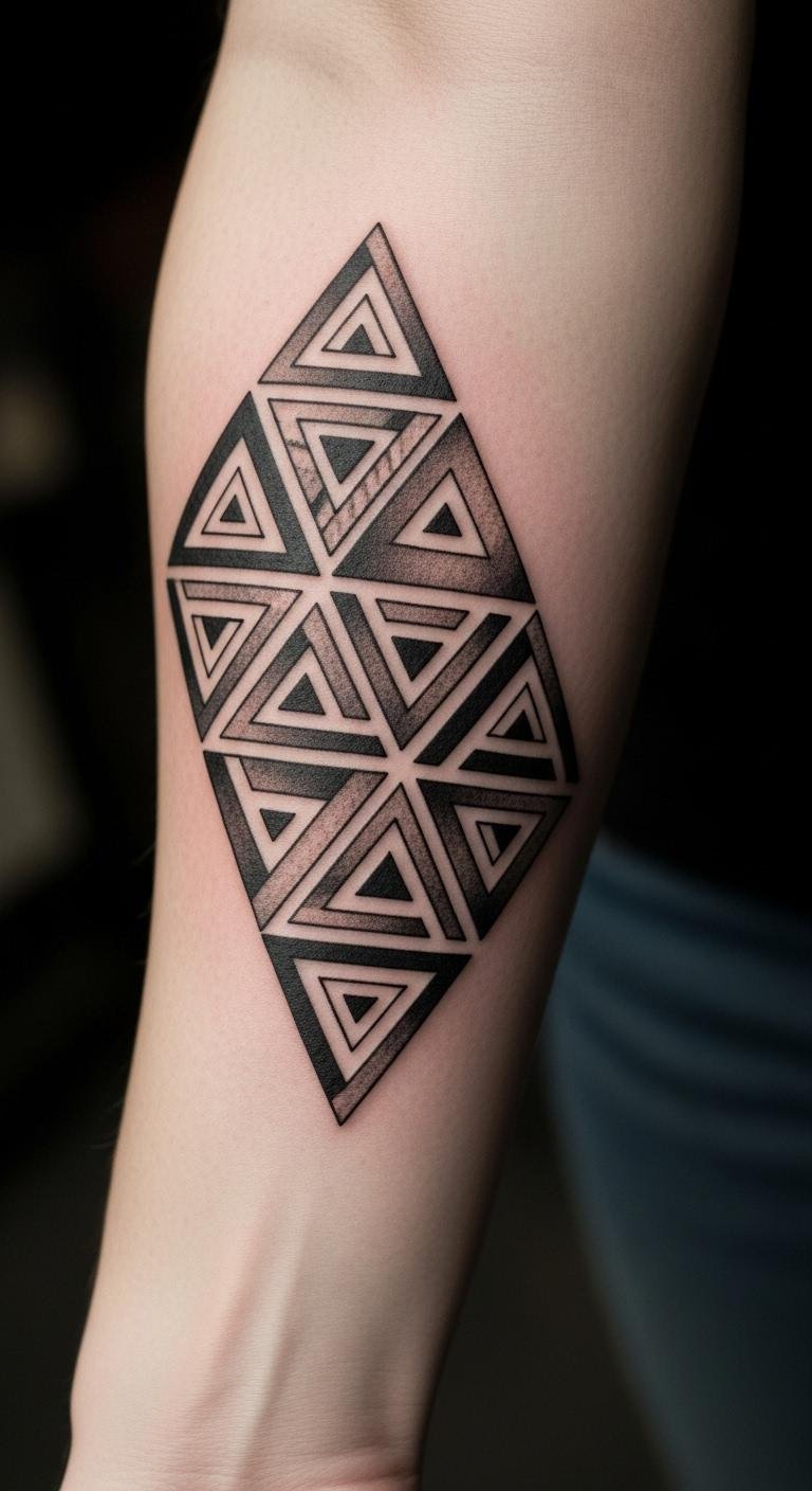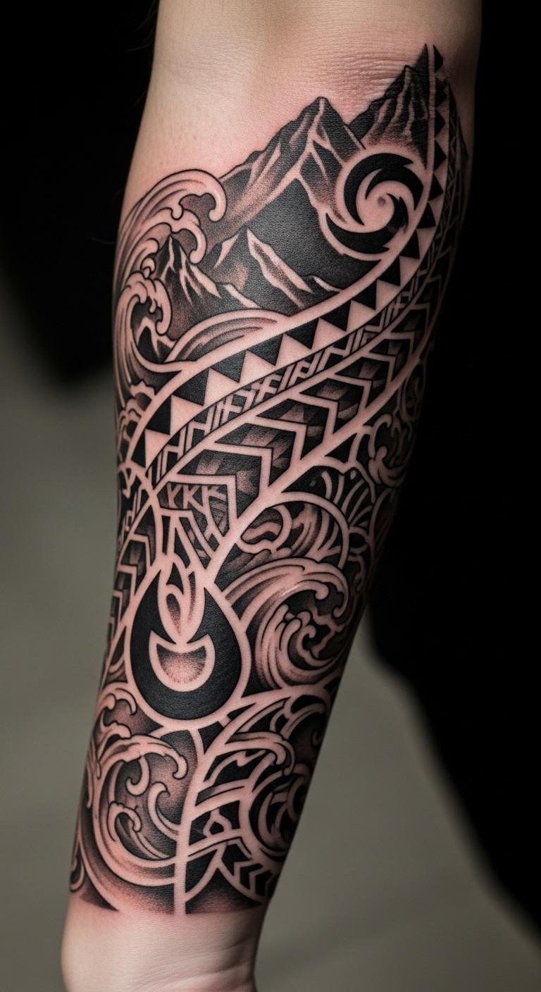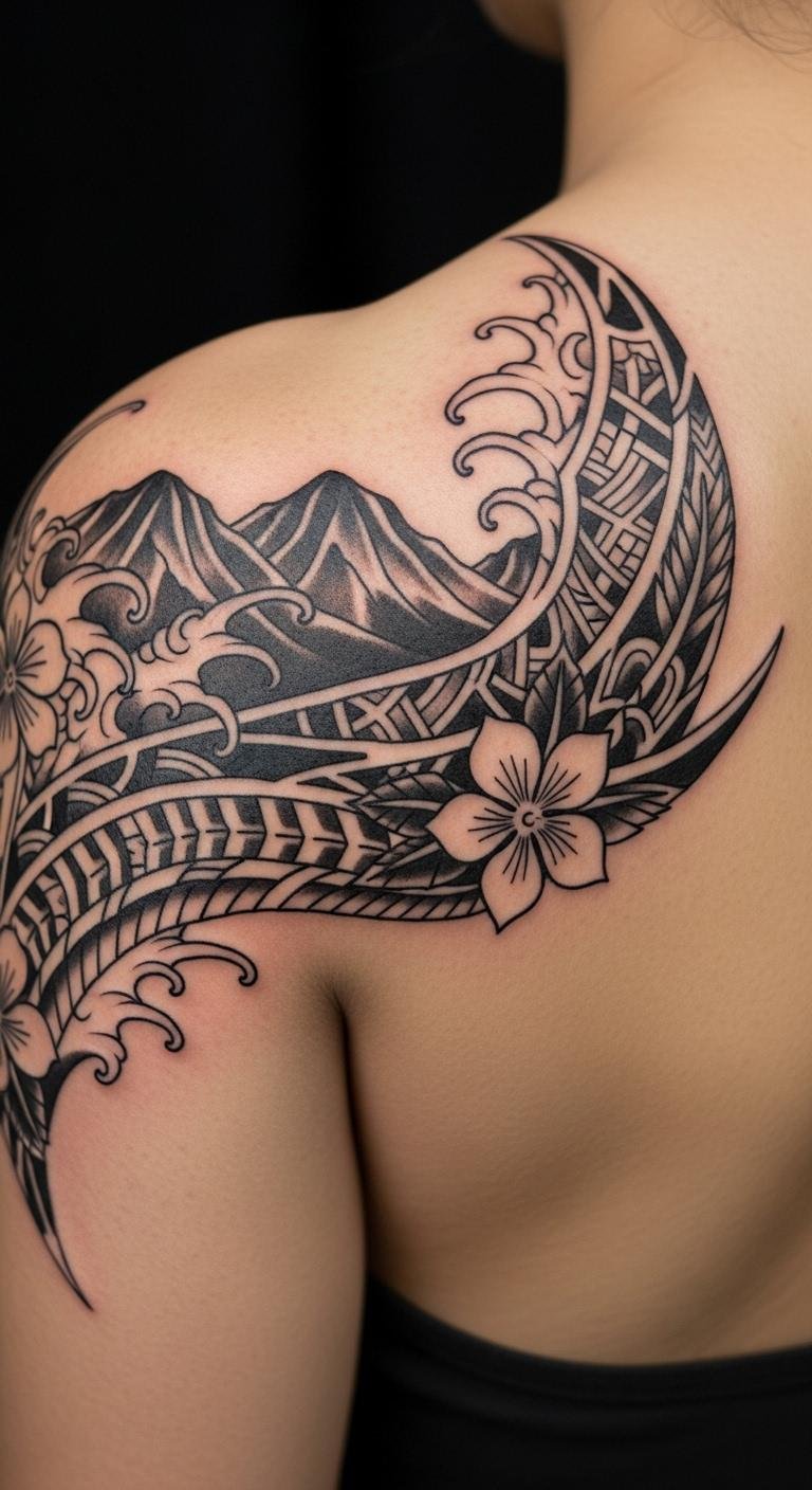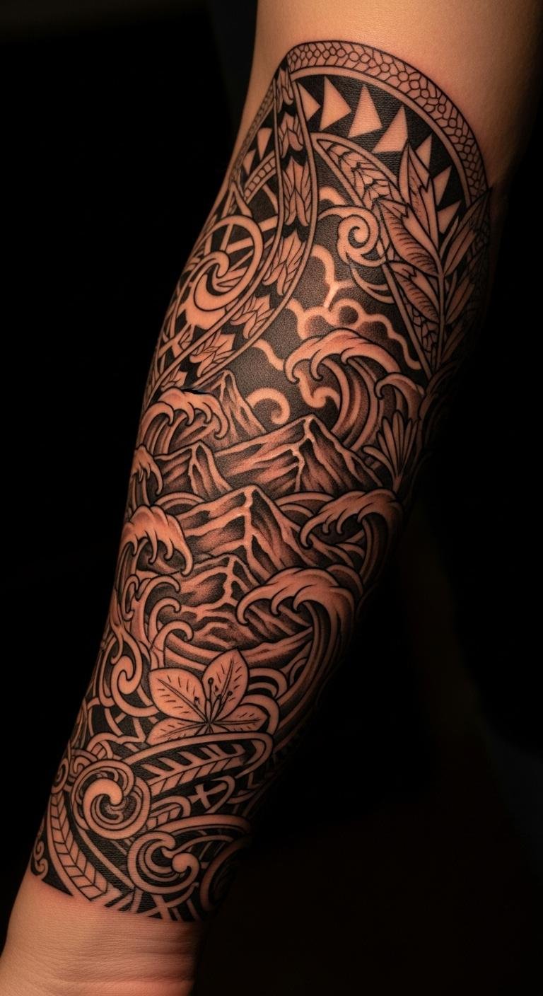 This tattoo design embodies the essence of Hawaiian culture, intertwining geometric patterns that evoke the strength of the ocean and the stability of the mountains.