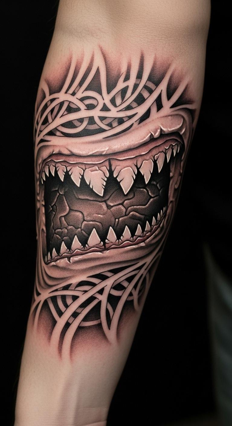 The shark teeth tattoo on the forearm serves as a powerful emblem of strength and warrior spirit, reflecting the wearer’s bravery and resilience.
