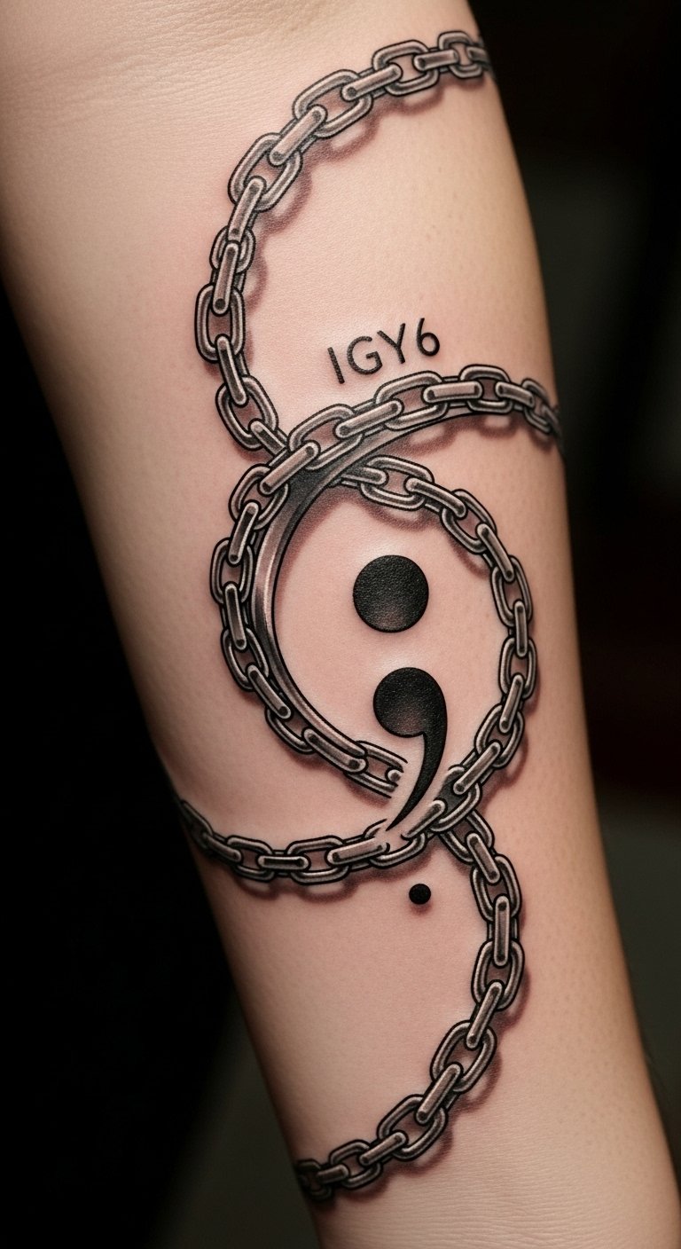 This tattoo design embodies the powerful message of resilience and support. The intertwined chains represent the unbreakable bonds shared with those who stand by you, while the IGY6 semicolon serves as a reminder of loyalty and perseverance.