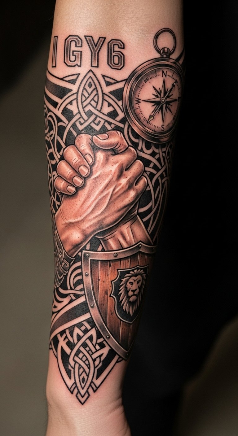 Each element, from the interlinked hands to the compass and shield, resonates with emotion, highlighting the importance of standing by one another through life’s challenges.