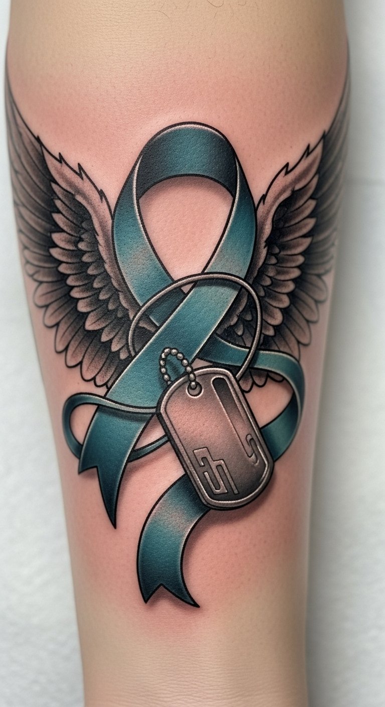 The tattoo elegantly combines the teal ribbon—a symbol of PTSD awareness—with a dog tag, representing the strength and sacrifice of those who’ve served.