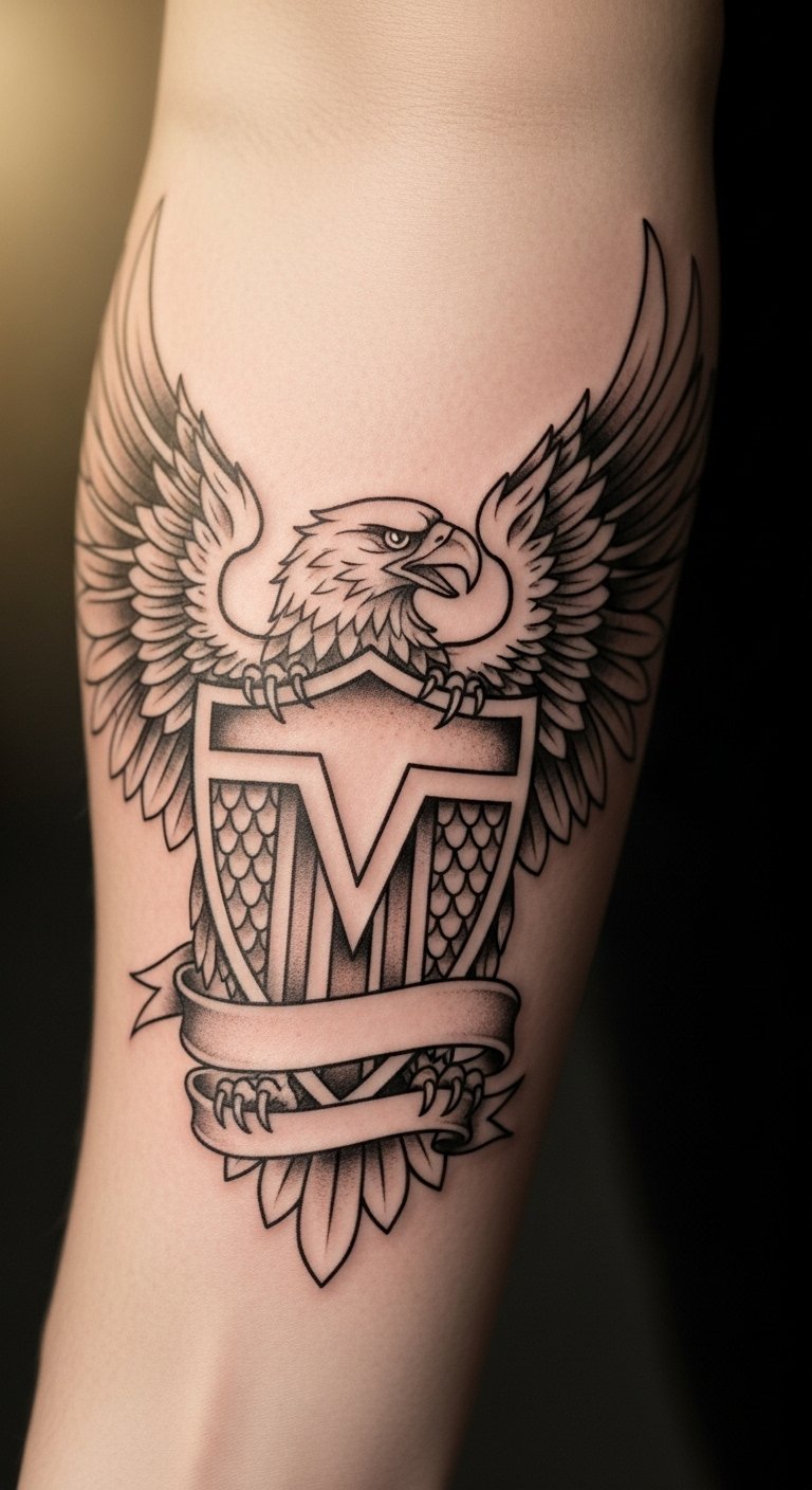 This tattoo represents a personal story of connection and resilience, with the eagle signifying freedom and strength, while the shield embodies protection and loyalty.