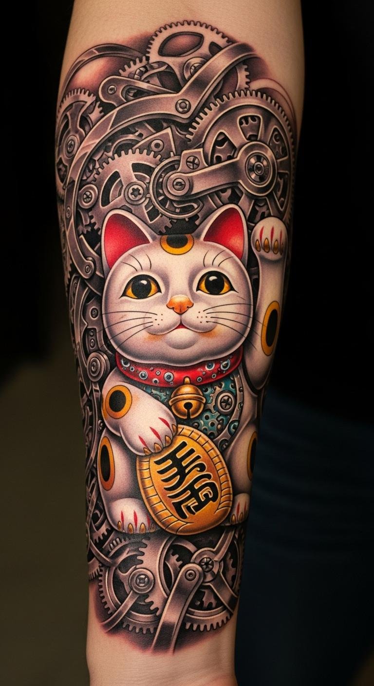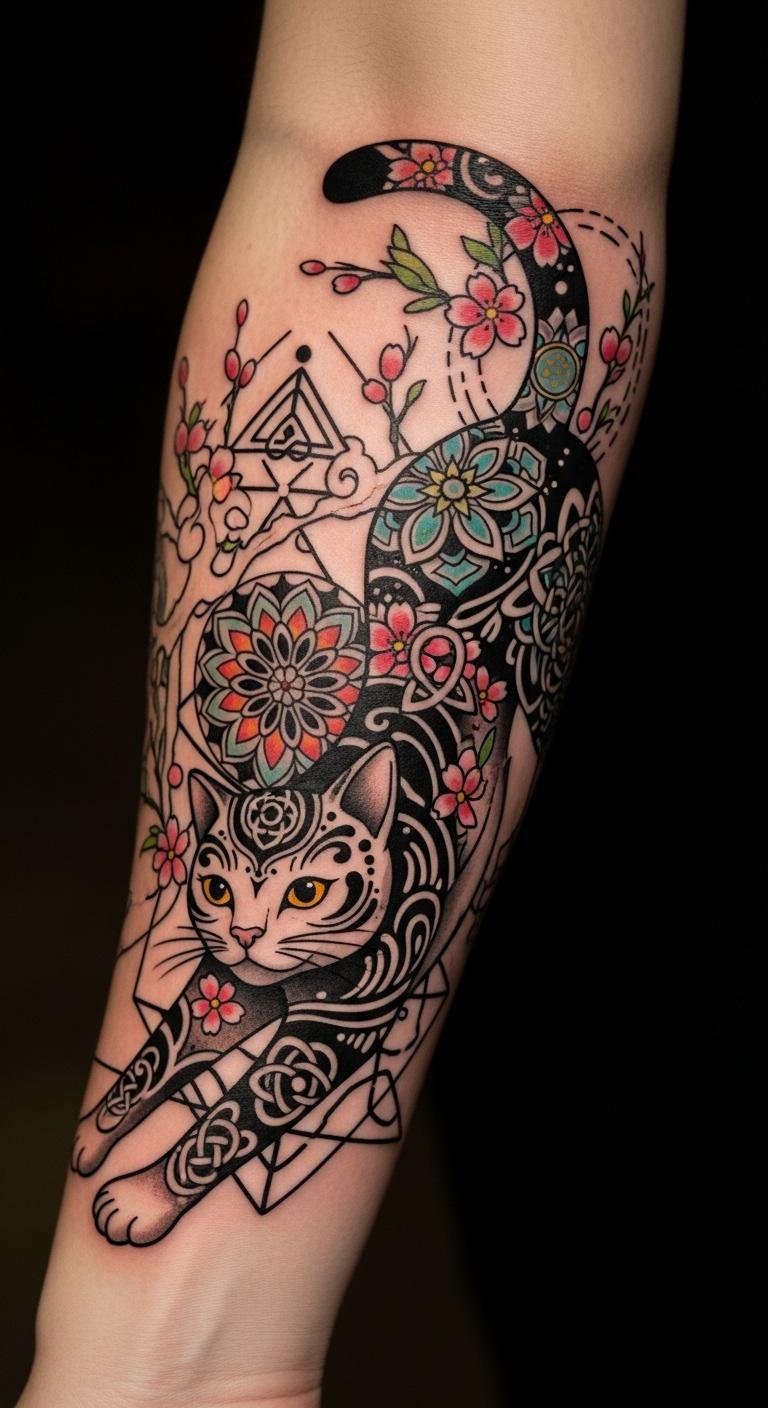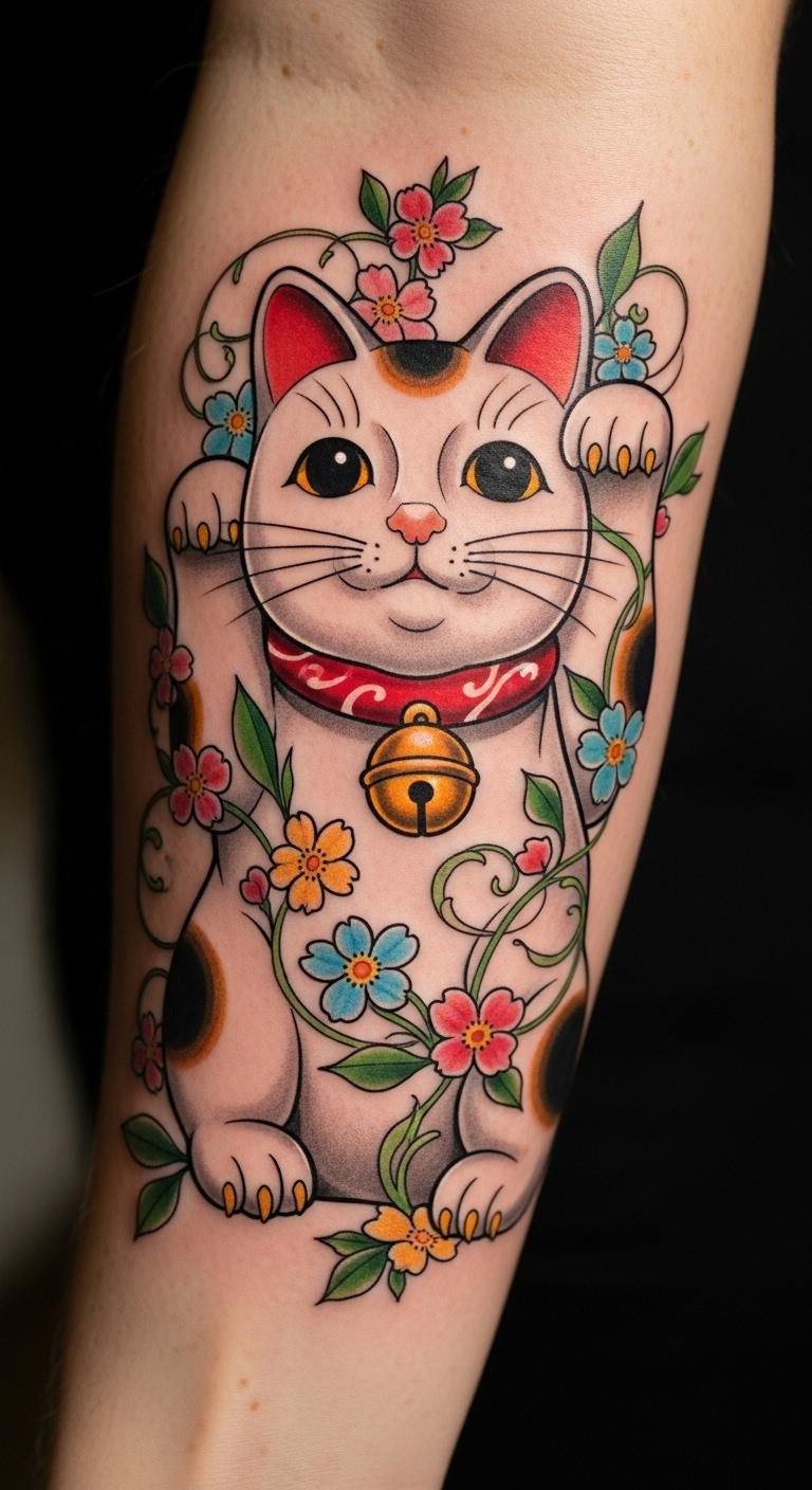 This tattoo design captures the essence of luck and protection that transcends cultures. The Japanese cat symbolizes good fortune, while the floral and geometric elements reflect a blend of global traditions.