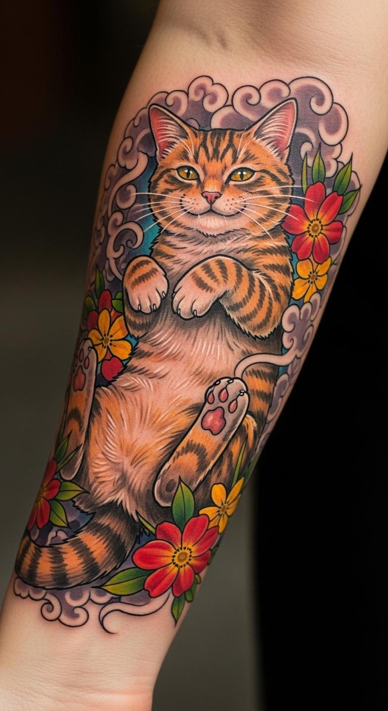 This Japanese cat tattoo symbolizes luck, protection, and companionship, drawing from the cultural significance of cats in Japanese folklore.