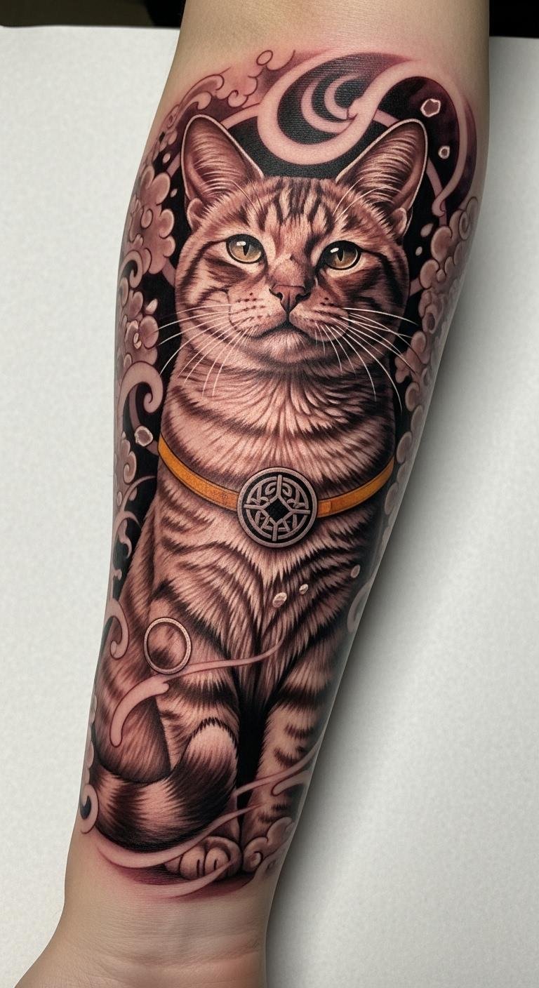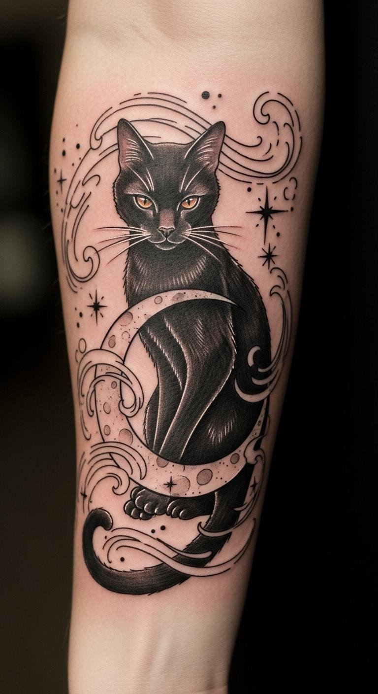 Placed on the forearm, the design invites admiration and interaction, allowing the wearer to share their connection to feline folklore with the world.