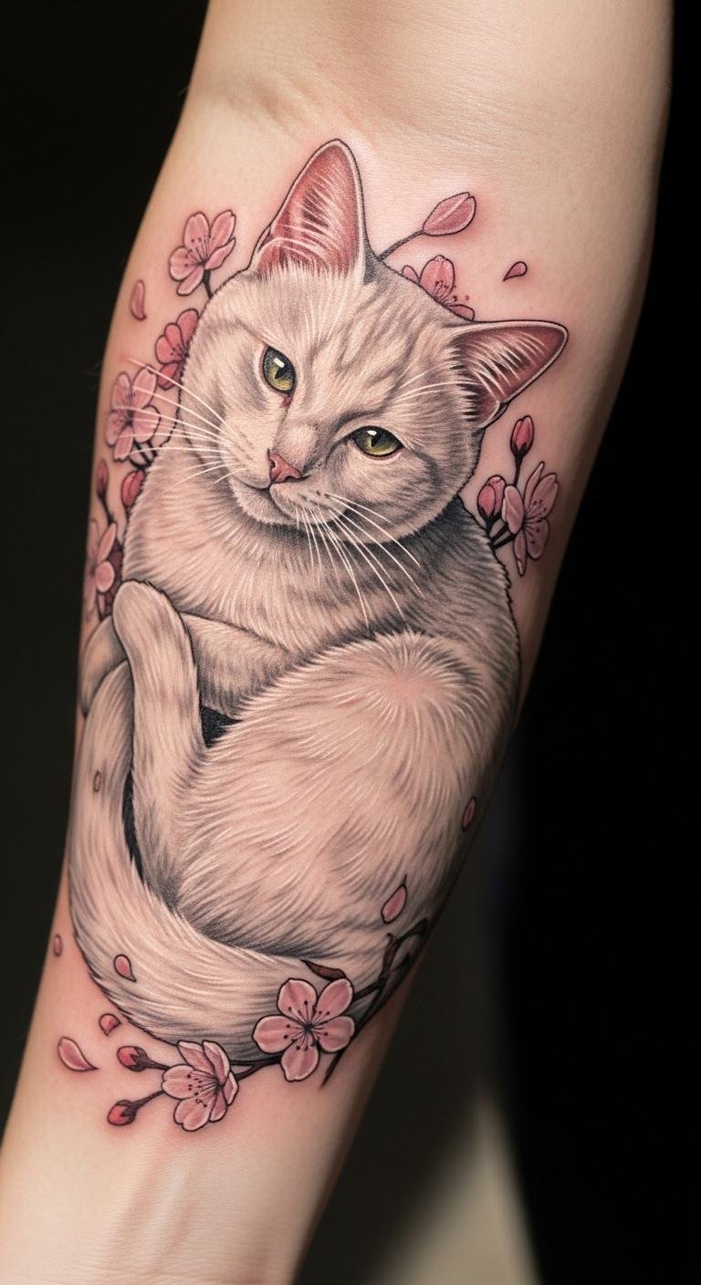 The white cat in this tattoo symbolizes purity and happiness, embodying the essence of serenity and positive energy. Its placement on the forearm allows for visibility, serving as a daily reminder of one’s inner peace and joyful spirit.