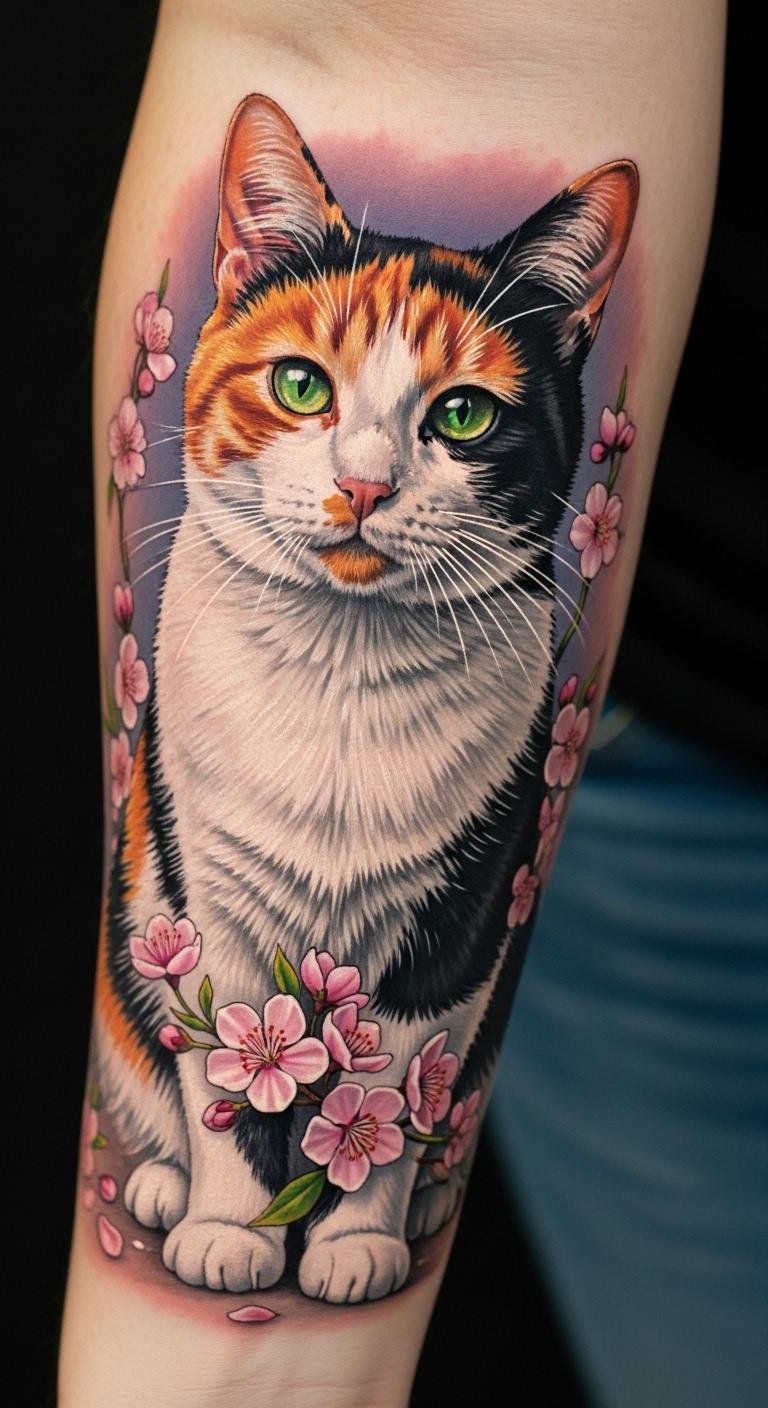 The tattoo of the calico cat serves as a symbol of prosperity and happiness, deeply rooted in Japanese culture. The vibrant colors and enchanting gaze embody good fortune and joy, making it a meaningful choice for those who appreciate the charm of these beloved felines.
