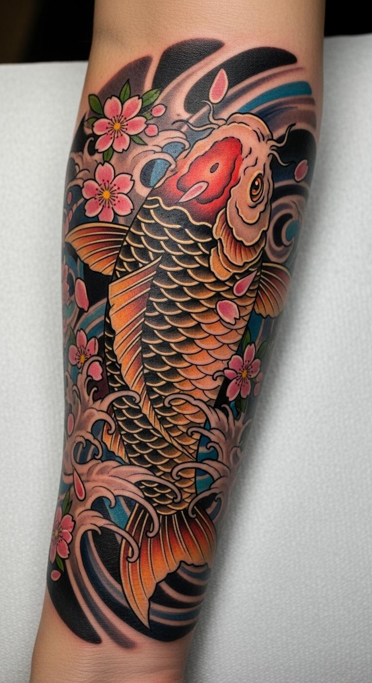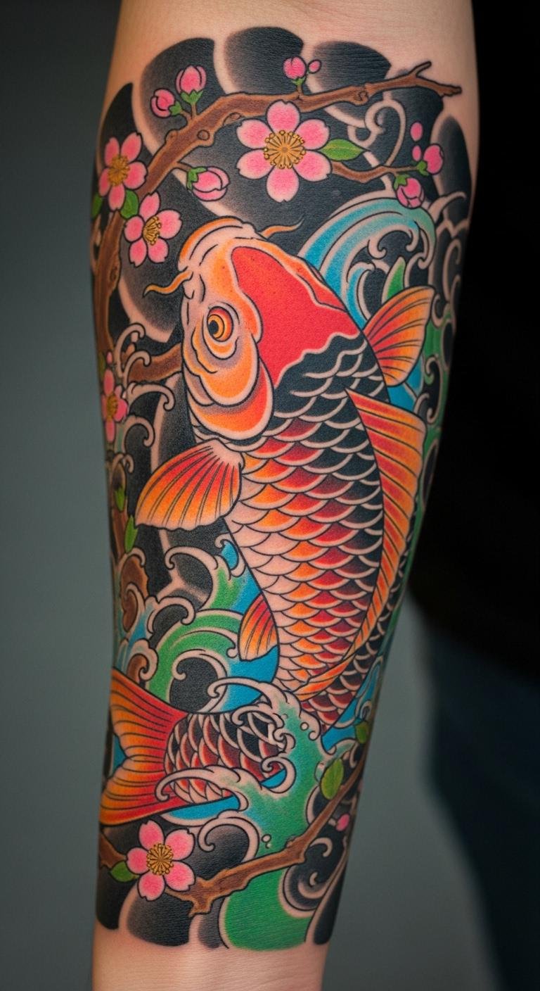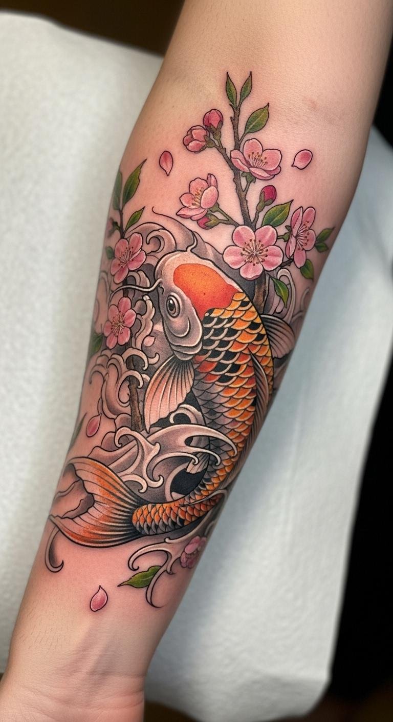 The koi fish tattoo, prominently displayed on the forearm, symbolizes perseverance and strength, making it a perfect reminder of the wearer’s resilience.