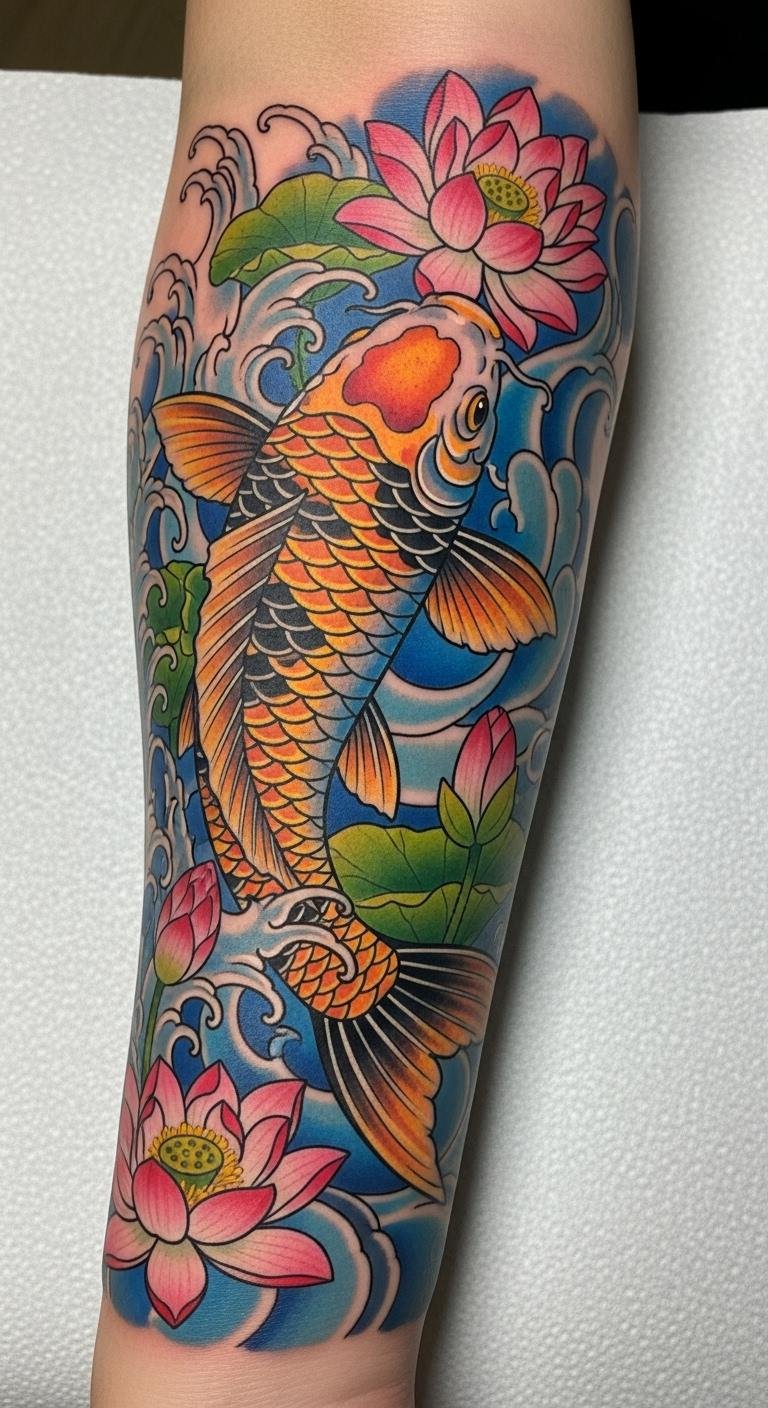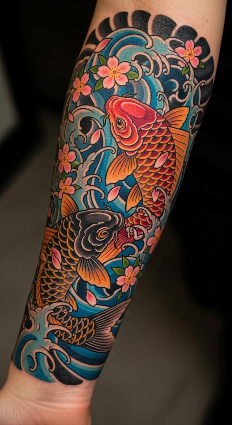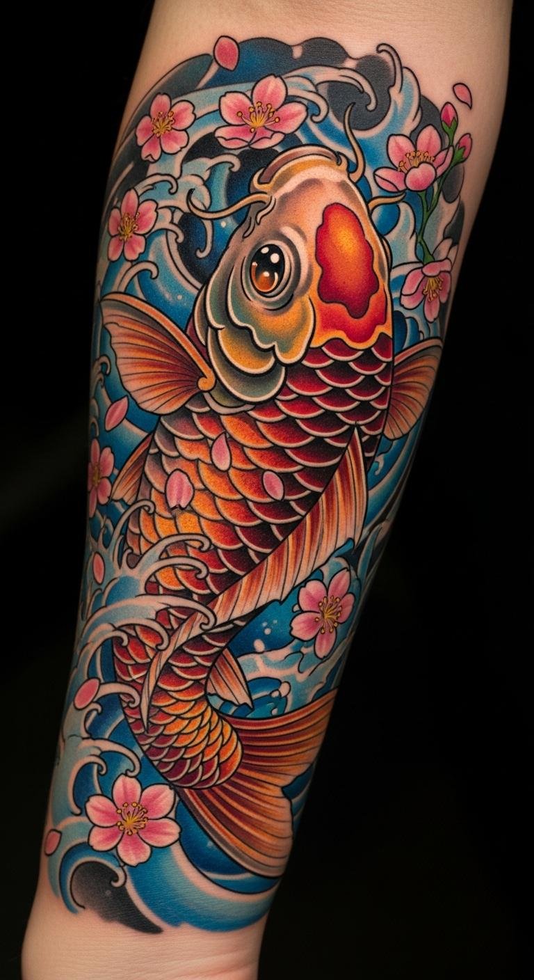 The koi fish tattoo, prominently displayed on the forearm, symbolizes perseverance and strength, making it a perfect reminder of the wearer’s resilience.