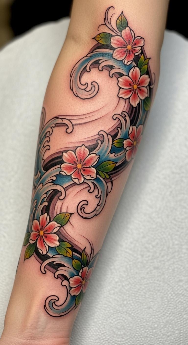The interplay of waves and flowers embodies resilience and growth, making it not just a design but an extension of the wearer’s spirit.